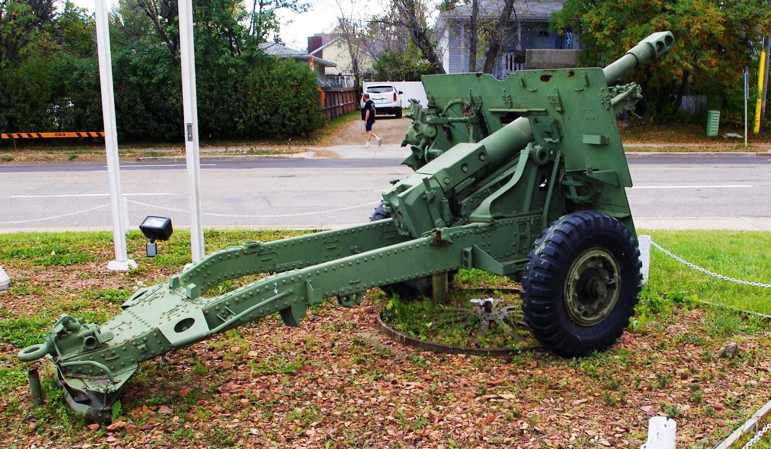 25-pounder C Mk. 2 QF Field Gun with No. 9 circular firing platform, at the cenotaph, corner of 2nd St and 6th Ave.