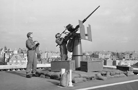20-mm Oerlikon AA Gun manned on the roof of the Canadian Military Headquarters (CMHQ), London, UK, ca 1942.