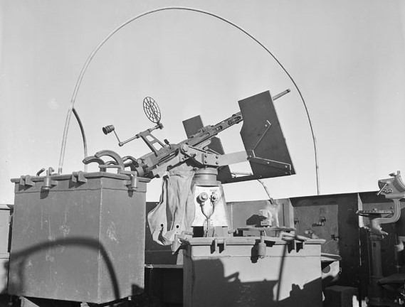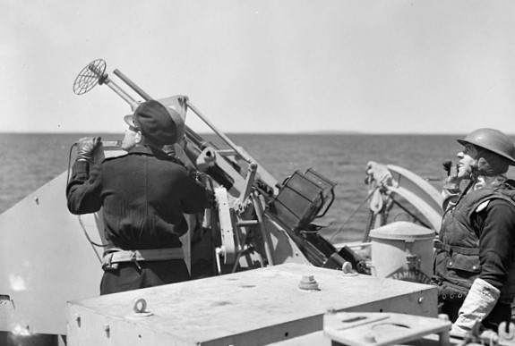 Oerlikon 20-mm/70 Light Anti-Aircraft Gun on HMS Hermione. The naval gunner utilising the rubber shoulder rests for high-angle firing. Note the Thornycroft depth charge thrower Mk. II and depth charge launching rail in the background.