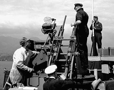 20-mm Oerlikon AA Gun being tested for range of motion onboard a ship, Vancouver, BC, May 1944.