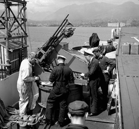 Workmen install twin Oerlikon guns in place of a single Oerlikon gun during carrier modification at Burrard Shipyard’s Lapointe Pier, May 1944.