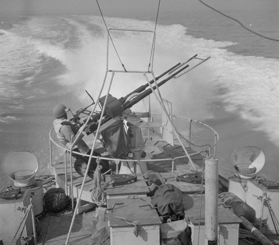 Twin 20-mm Oerlikon anti-aircraft guns aboard a motor torpedo boat (MTB) of the Canadian-manned 29th MTB Flotilla, RN, May 1944.