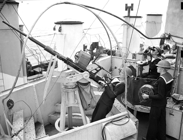 The crew of one of HMCS Iroquois’ Oerlikon anti-aircraft guns at action stations during a training exercise off Halifax, Nova Scotia, 2 June 1944.
