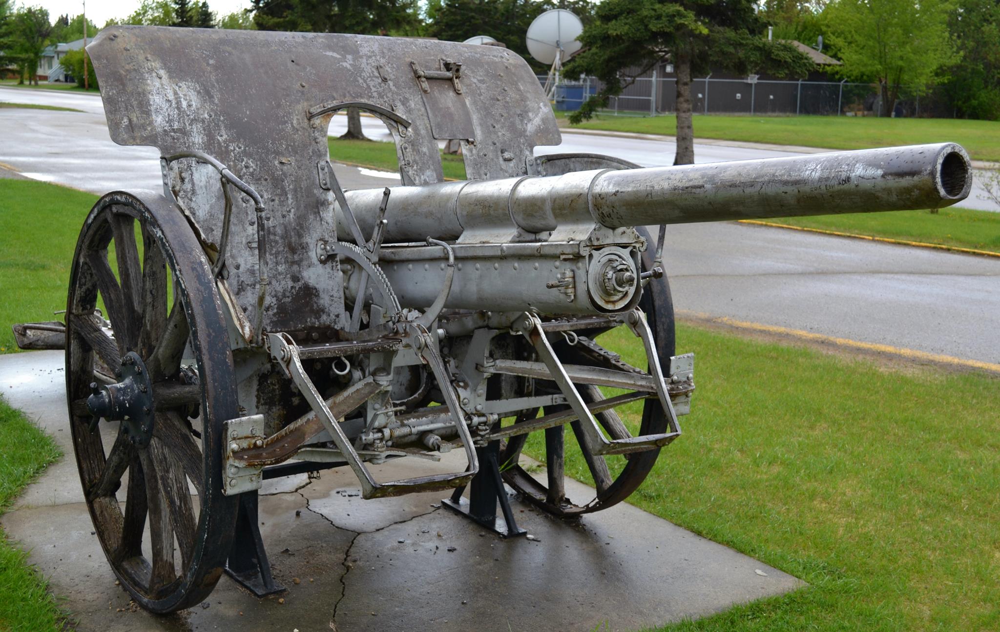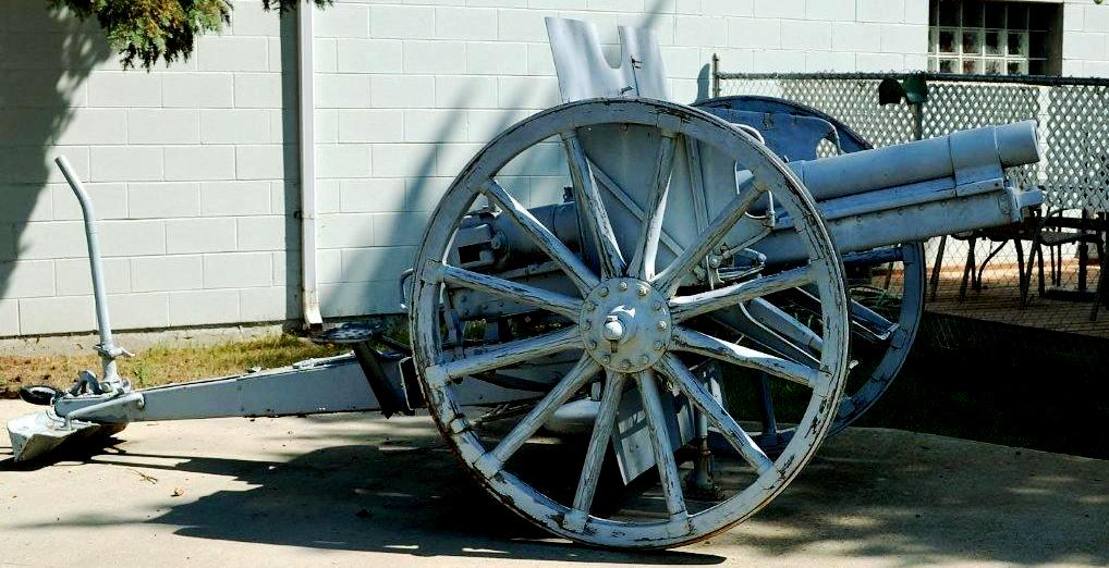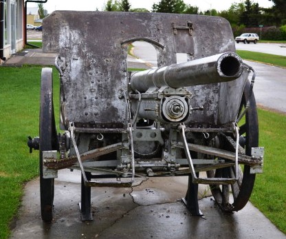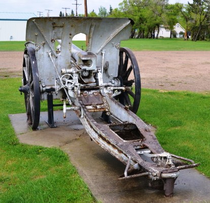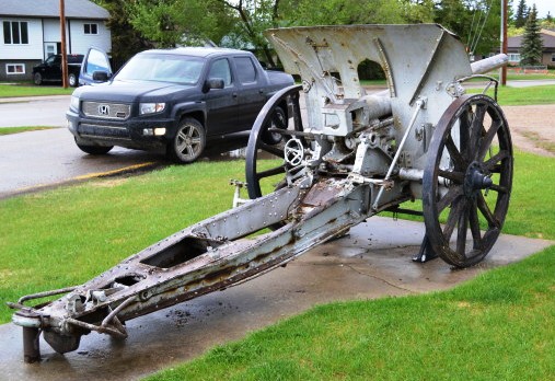 German Great War 10.5-cm leichtes Feldhaubitze 16 (10.5-cm leFH 16), (Serial Nr. 16660), likely captured by a Canadian Battalion within an Infantry Brigade of a Canadian Division of the Canadian Expeditionary Force (CEF). Battleford cenotaph.