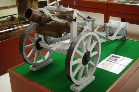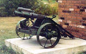 .45-inch calibre Gatling Gun, mounted on a wood wheeled carriage. Gatling Guns were used in the engagements at Cut Knife and Batoche in 1885.