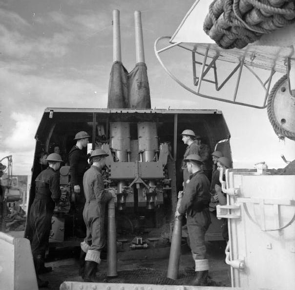 4-inch/45 QF Mk. XVI* Gun on the High Angle Twin Mk. XIX mounting (Serial No. 146), HMS Wheathead. 405-24 St E. (CJ Ware Photo, Royal Navy, IWM Photo A 8568).