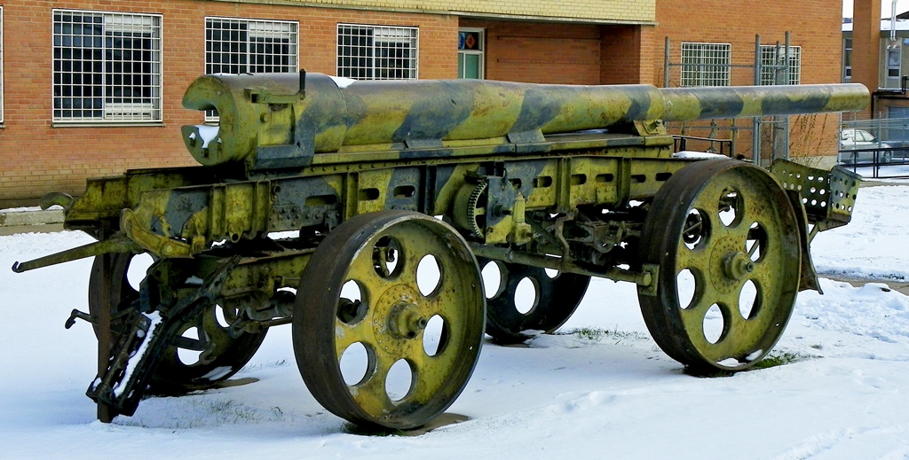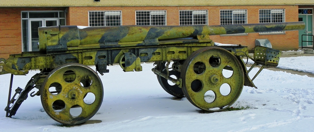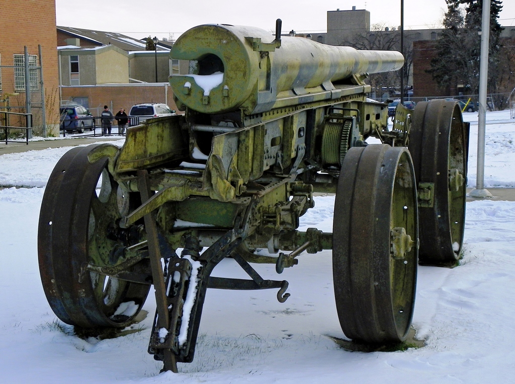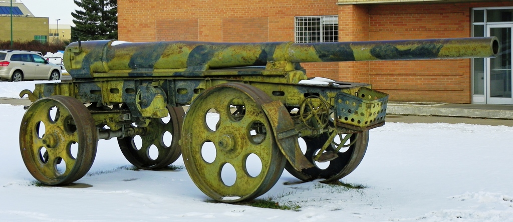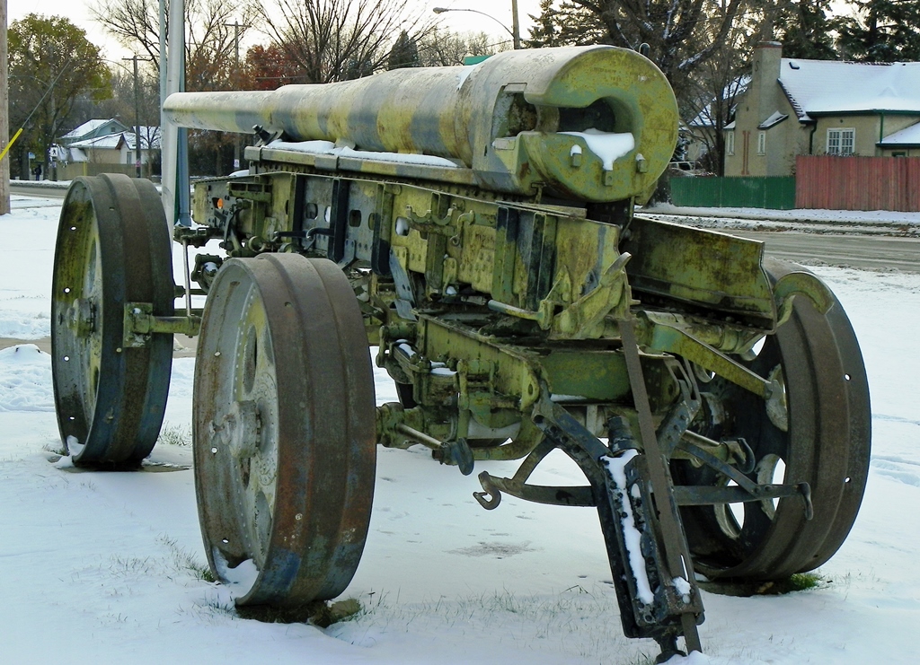 German Great War 15-cm Kanone 16 (15-cm K 16), (Serial Nr. 1034), no data. This gun is missing its wheel carriage. It is mounted on a barrel transporter carriage, and located in front of the Sgt Hugh Cairns VC Armoury, Idyllwild Avenue.