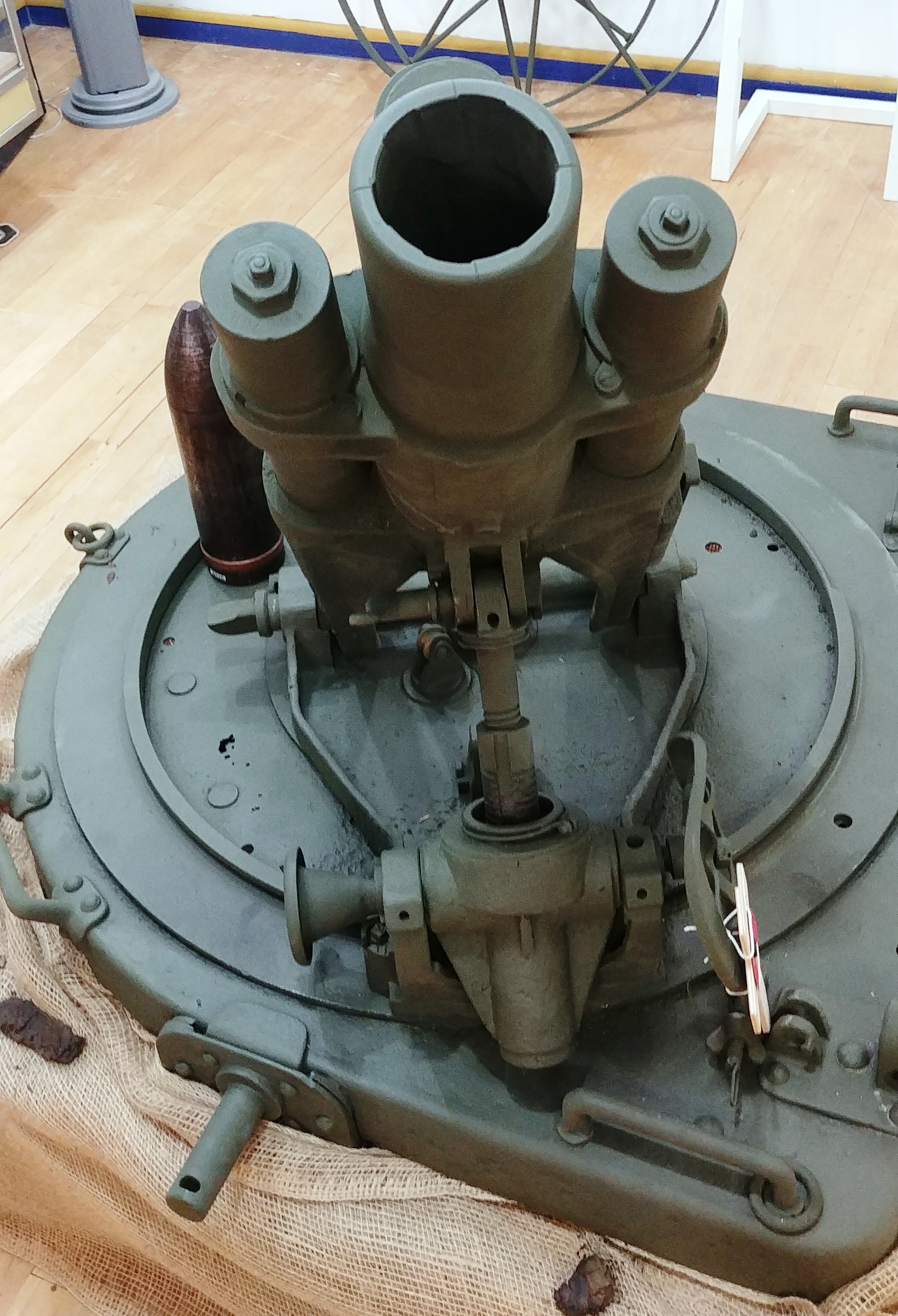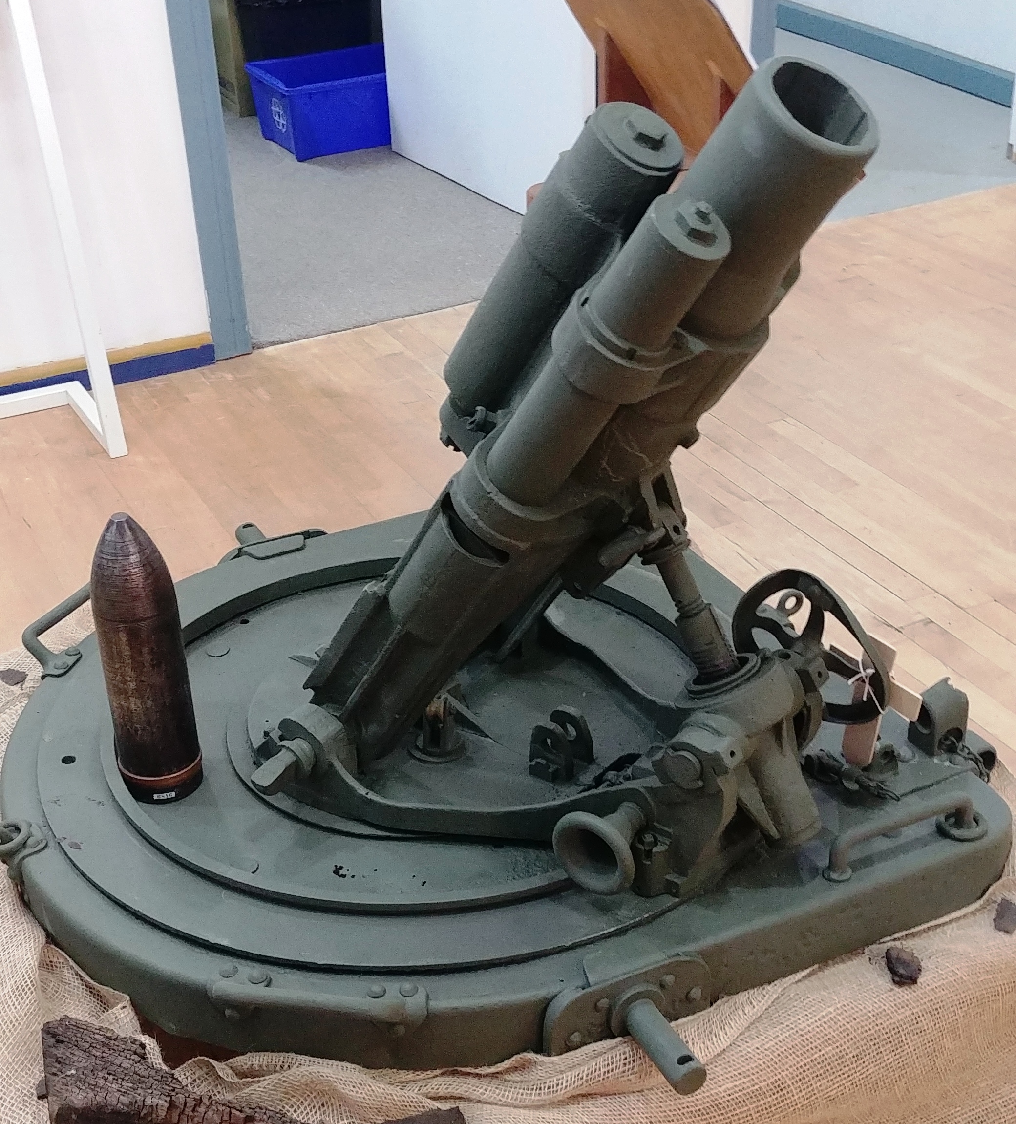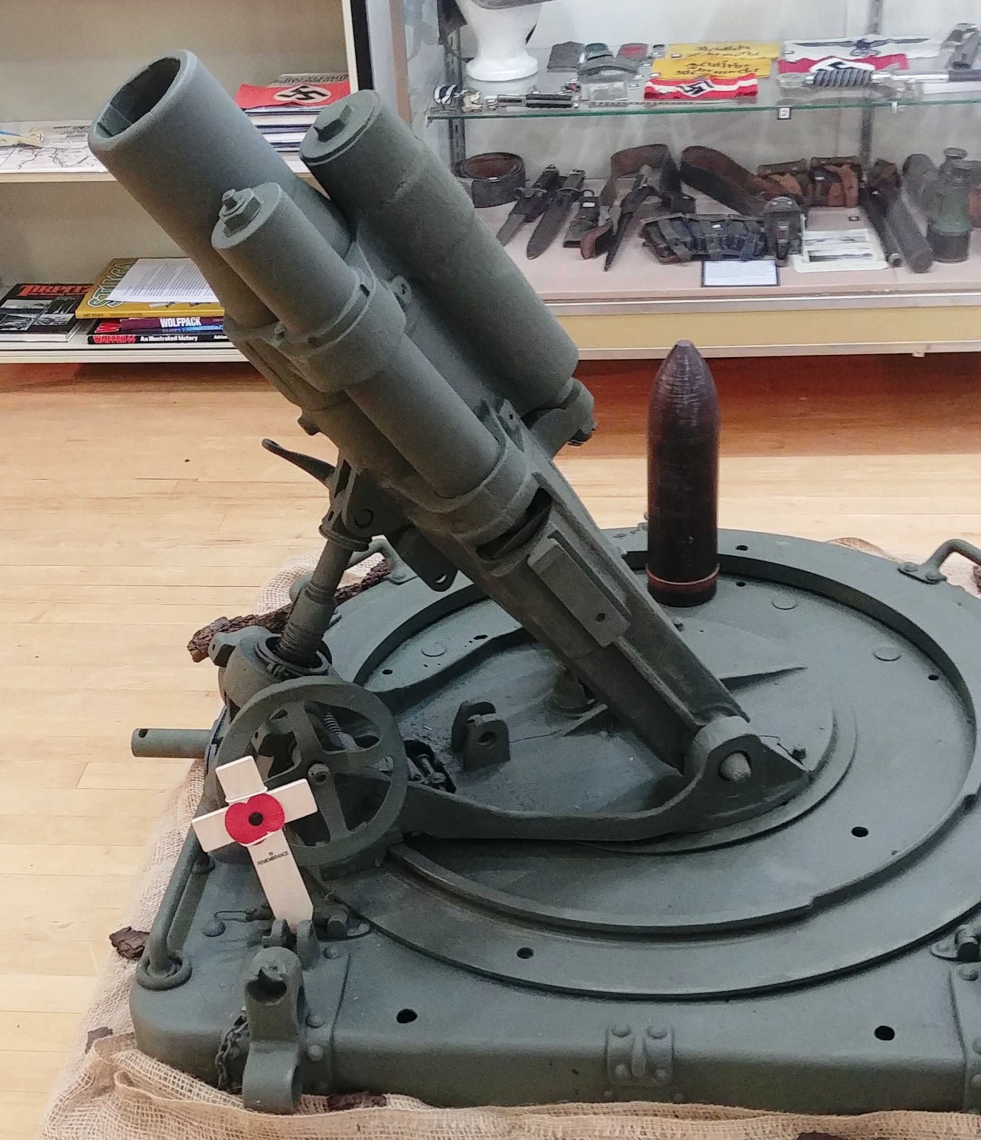 German First World War 7.58-cm leichtes Minenwerfer neuer Art (7.58-cm leMW), Trench Mortar, (Serial Nr. 16676), captured by a Canadian Battalion within an Infantry Brigade of the 2nd Canadian Division of the Canadian Expeditionary Force (CEF), in France ca. 1918. Previously on display on its base plate in front of the Royal Canadian Legion, Nutana Branch No. 362, 3021 Louise Street, it is now indoors in the Saskatoon Museum of Military Artifacts. This gun was originally allocated to Davidson, Saskatchewan.
