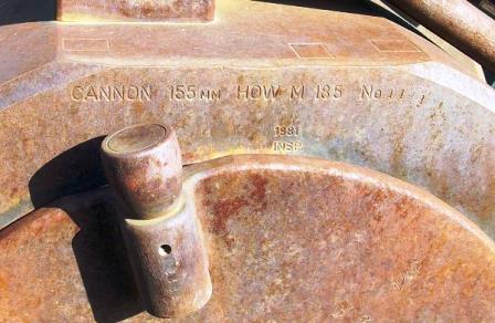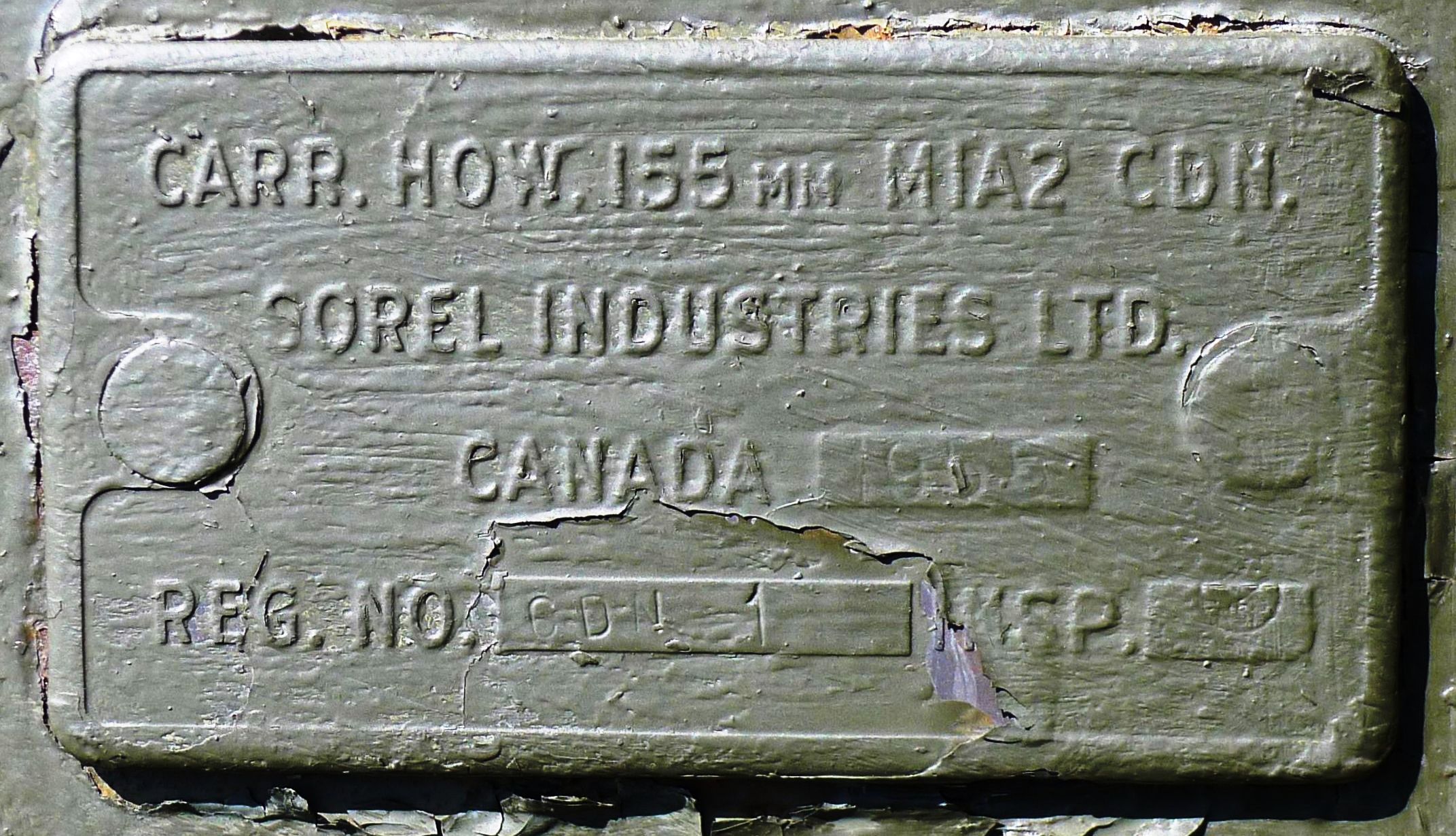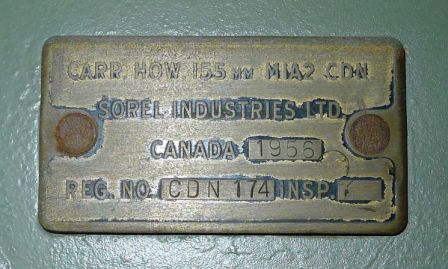 155-mm C1 (M1A2) Medium Howitzer on M1A2 Carriage, aka M114, manufactured at Sorel Industries Limited in Quebec, Queen Elizabeth II cypher.  Reg. No. CDN 1. The carriage plate reads: CARR HOW 155mm M1A2 CDN, SOREL INDUSTRIES LTD, CANADA (1952), REG. NO. CDN 1, INSP (symbol).  1 RCHA.
