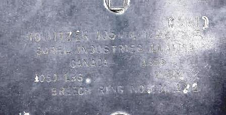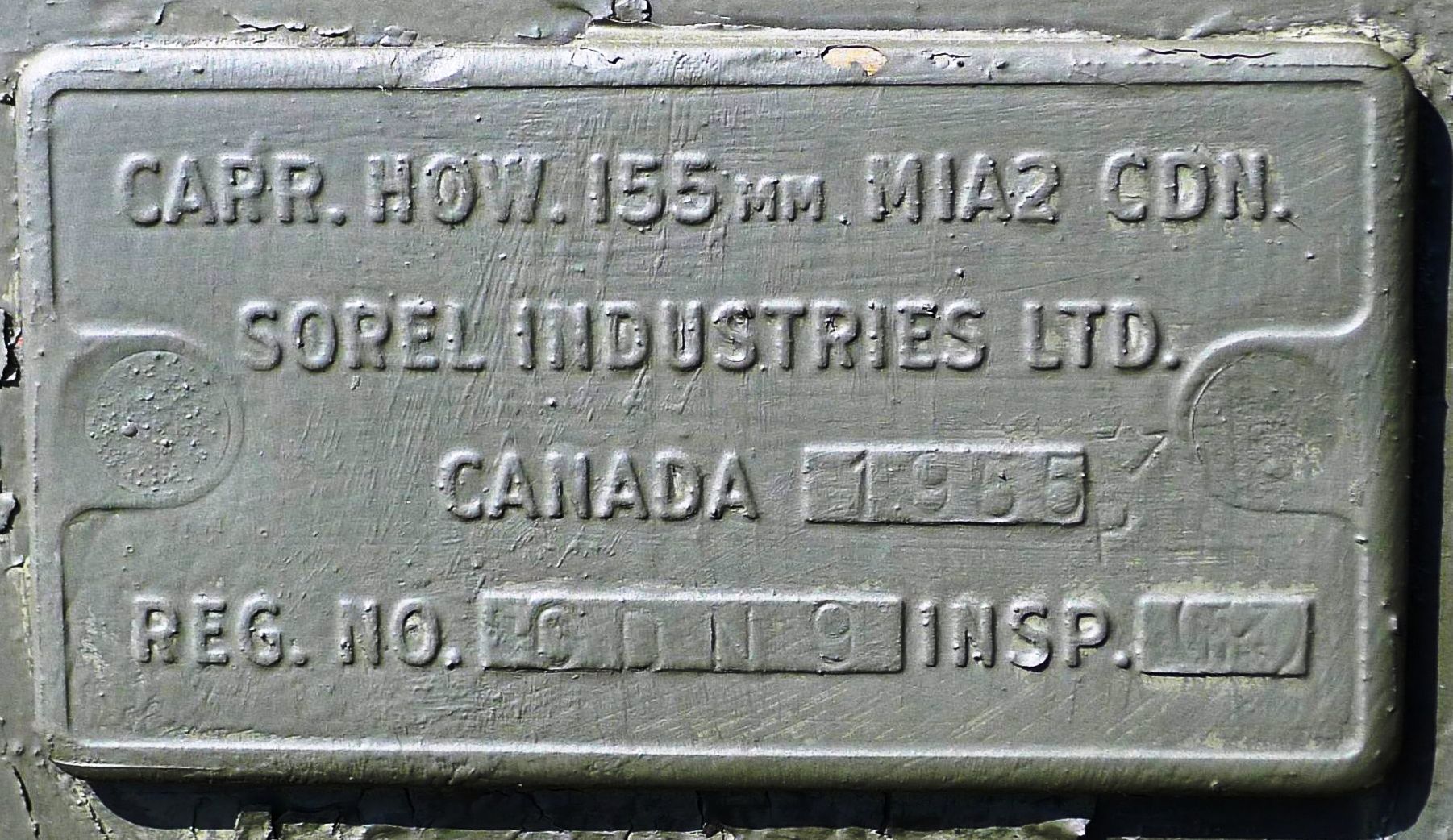 155-mm C1 (M1A2) Medium Howitzer on M1A2 Carriage, aka M114, manufactured at Sorel Industries Limited in Quebec, Queen Elizabeth II cypher.  Reg. No. 9.  The carriage plate reads: CARR HOW 155mm M1A2 CDN, SOREL INDUSTRIES LTD, CANADA (year TBC), REG. NO. CDN 9, INSP (Symbol).  1 RCHA.