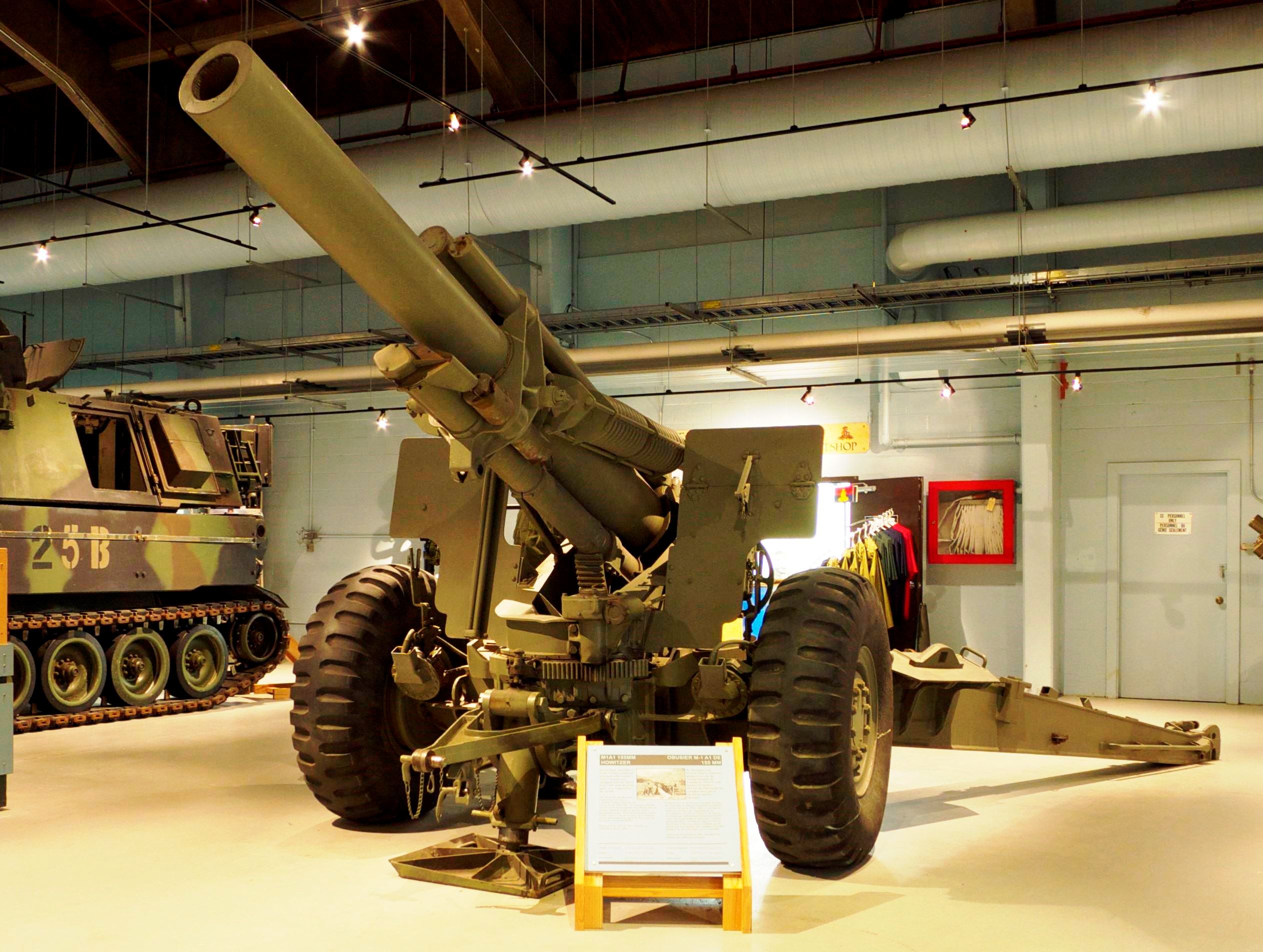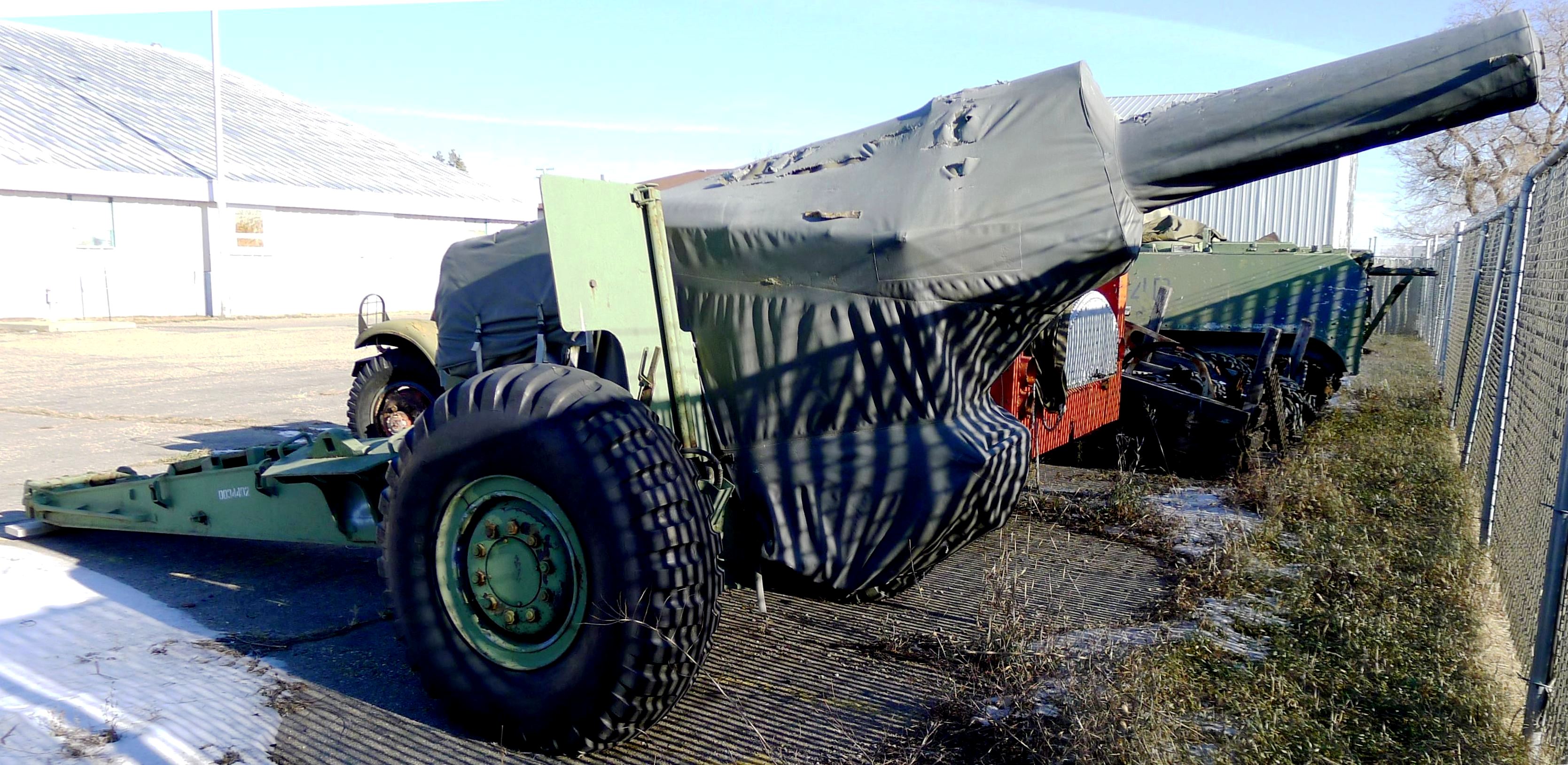 155-mm C1 (M1A2) Medium Howitzer, M114/39.  This Gun was manufactured at Sorel Industries Limited in Québec), modified with an American M185 39-calibre barrel (Serial No. 1141) by RDM Technologies in the Netherlands to M114/39 configuration.  RDM  developed a conversion kit which enabled the US 155 mm M114 towed howitzer to fire new extended range ammunition.  The company reputedly converted two Canadian 155-mm Howitzers to the M114/39 configuration and completed trials with them in Canada, however Canada did not proceed with an upgrade to the M114/39 standard.  CFR 34441.  The carriage plate reads CARR. HOW. 155MM M1A2 CDN. SOREL INDUSTRIES LTD. CANADA (year TBC), REG. NO. CDN 27, INSP (Symbol).