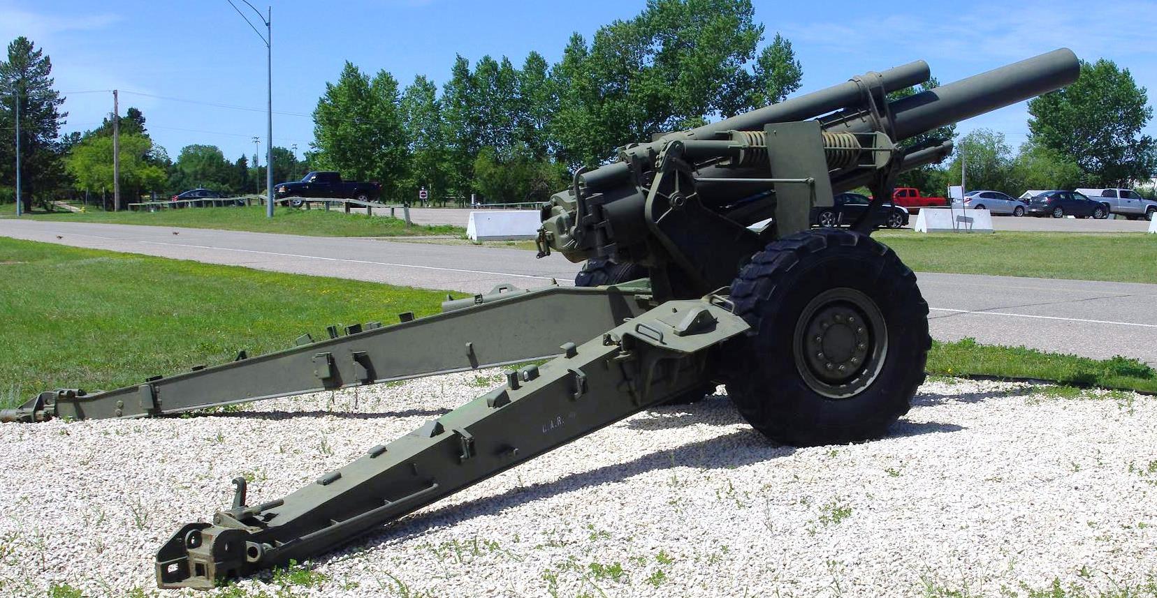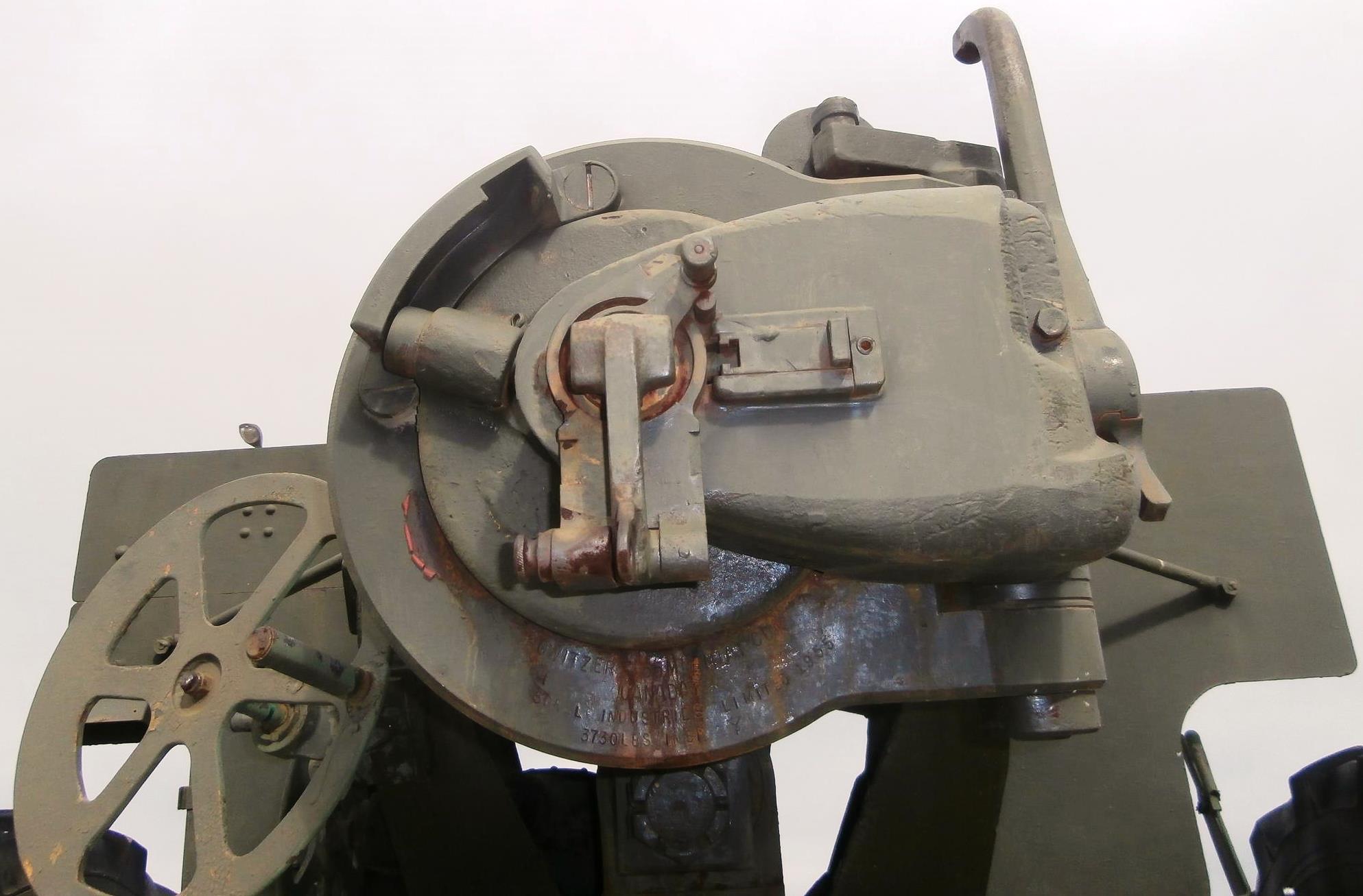 155-mm C1 (M1A2) Medium Howitzer on M1A2 Carriage, aka M114, manufactured at Sorel Industries Limited in Quebec, Queen Elizabeth II cypher.  CFR 34402, Reg. No. 174.  The carriage plate reads: CARR HOW 155mm M1A2 CDN, SOREL INDUSTRIES LTD, CANADA (1956), REG. NO. CDN 174, INSP (Maple Leaf).