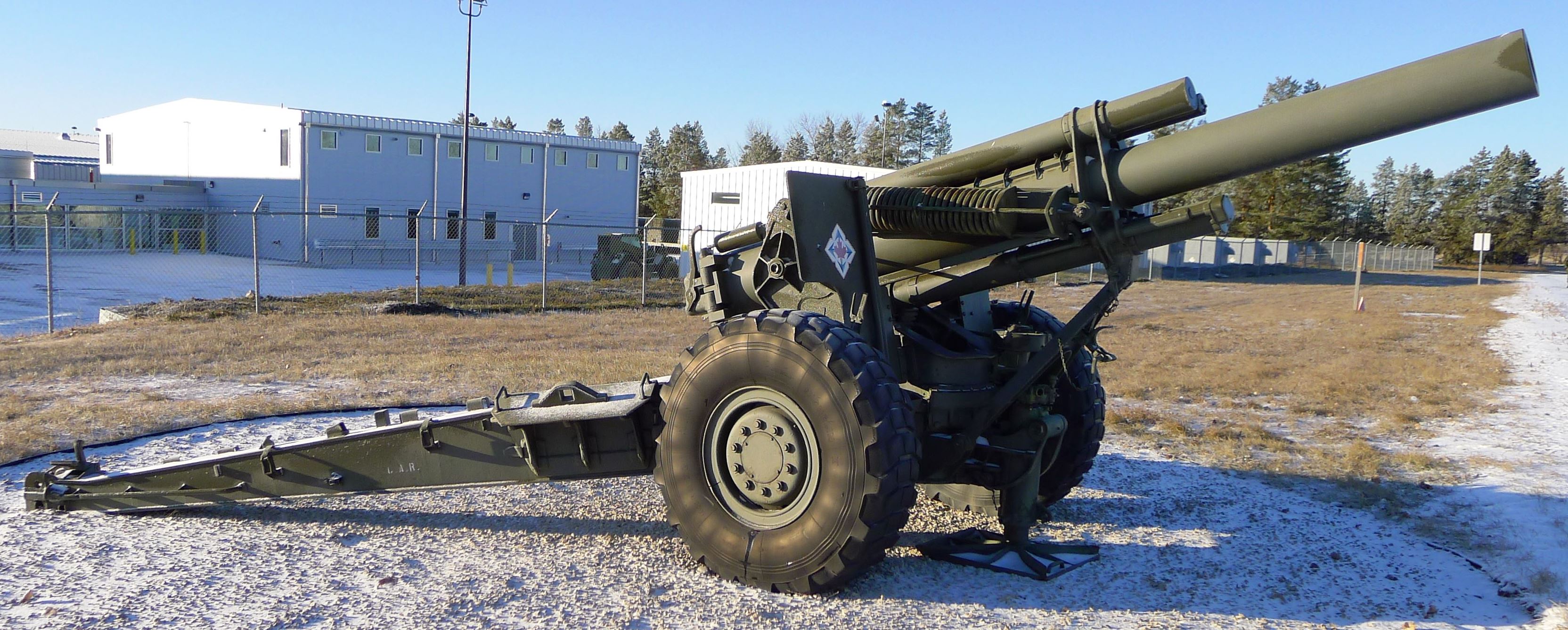 155-mm C1 (M1A2) Medium Howitzer on M1A2 Carriage, aka M114, manufactured at Sorel Industries Limited in Quebec, Queen Elizabeth II cypher.  CFR 34402.  The carriage plate reads: CARR. HOW. 155MM M1A2 CDN. SOREL INDUSTRIES LTD. CANADA (year TBC), REG. NO. CDN 152, INSP (Symbol).