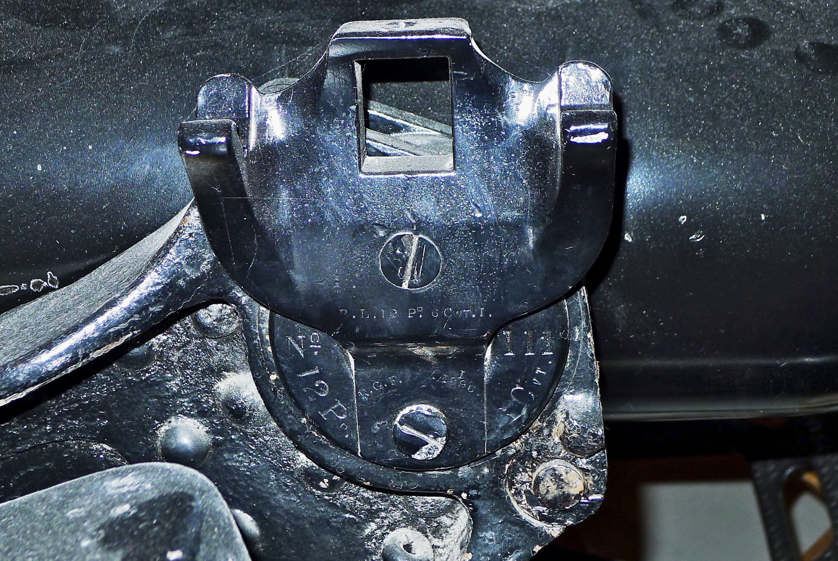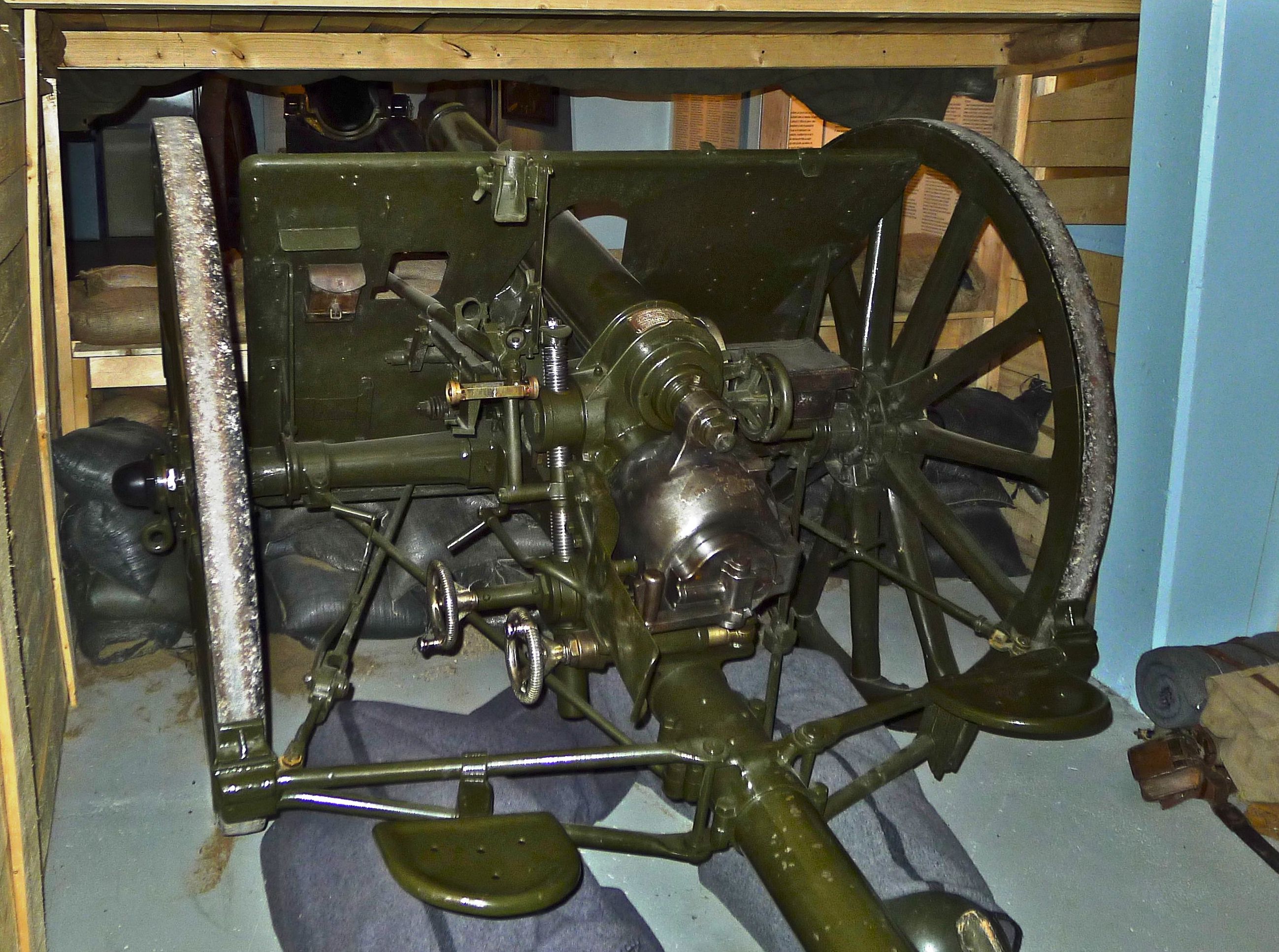 1-pounder QF Mk. I (Maxim) Gun, V.S.M. (Vickers, Sons & Maxim Limited) 1905, Automatic Gun, (Serial No. 2497), weight 410 lbs, Reg. No. 117, mounted on a 1-pounder QF Mk. II gun carriage, RCD, 1906, Reg No. C10444.  This “pom-pom” gun stands inside the main entrance to the Base HQ.