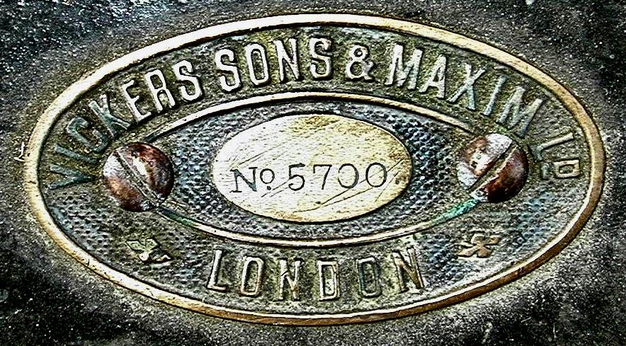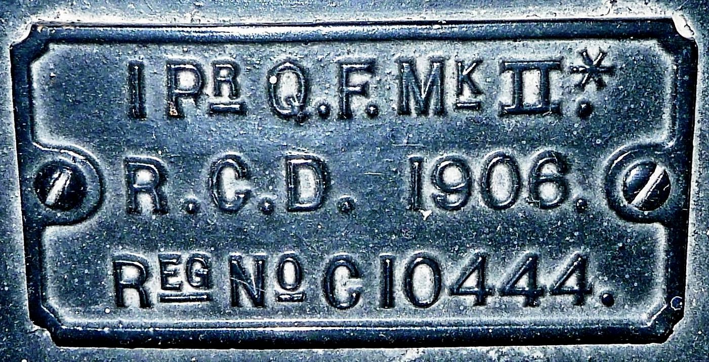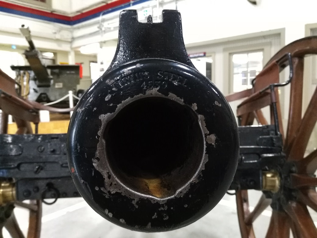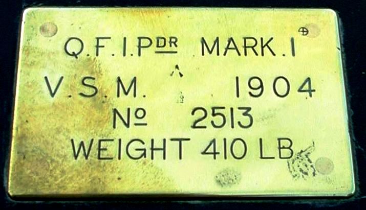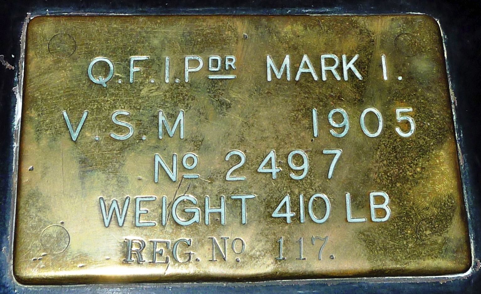 1-pounder QF Mk. I (Maxim) Gun, V.S.M. (Vickers, Sons & Maxim Limited) 1904, Automatic Gun, (Serial No. 2513), weight 410 lbs, mounted on a VSM London gun carriage, (Serial No. 5700).  Base HQ.