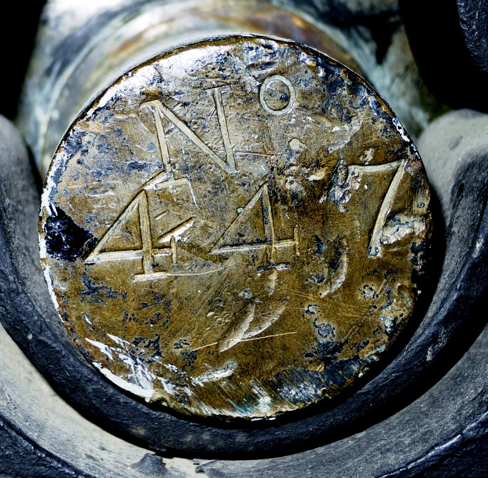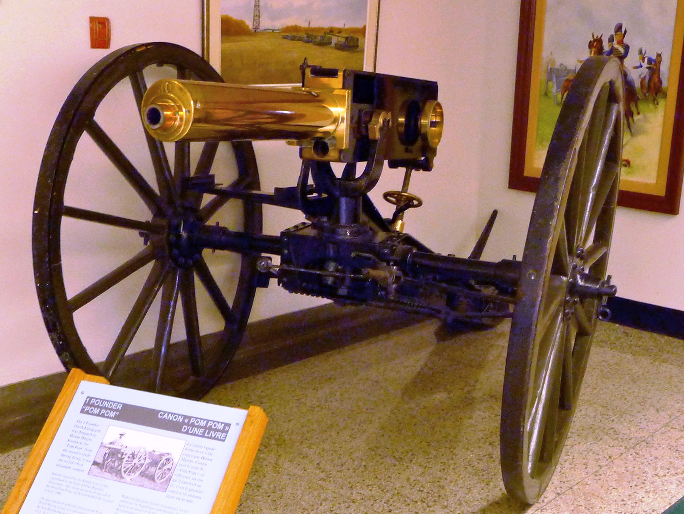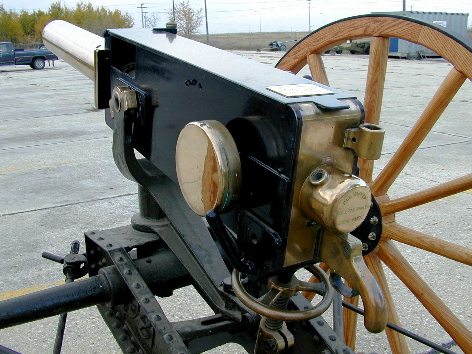1-pounder QF Mk. I (Maxim) Gun, V.S.M. (Vickers, Sons & Maxim Limited) 1904, Automatic Gun, (Serial No. 2513), weight 410 lbs, mounted on a VSM London gun carriage, (Serial No. 5700).  Base HQ.
