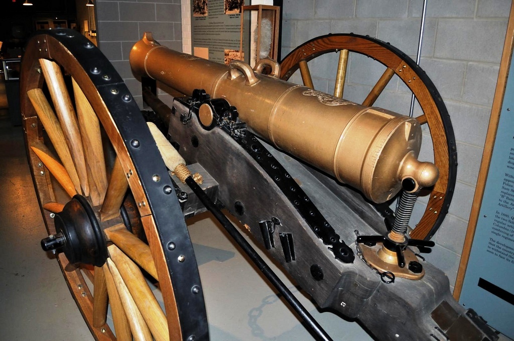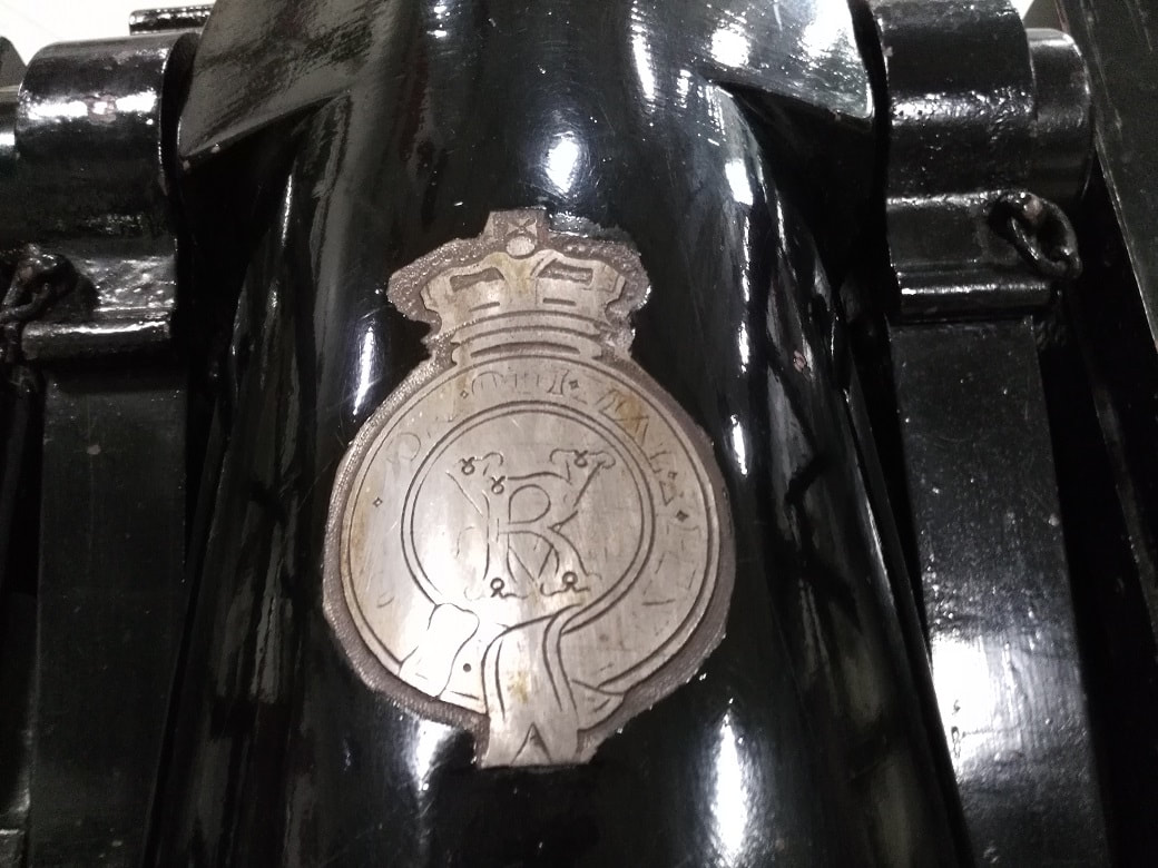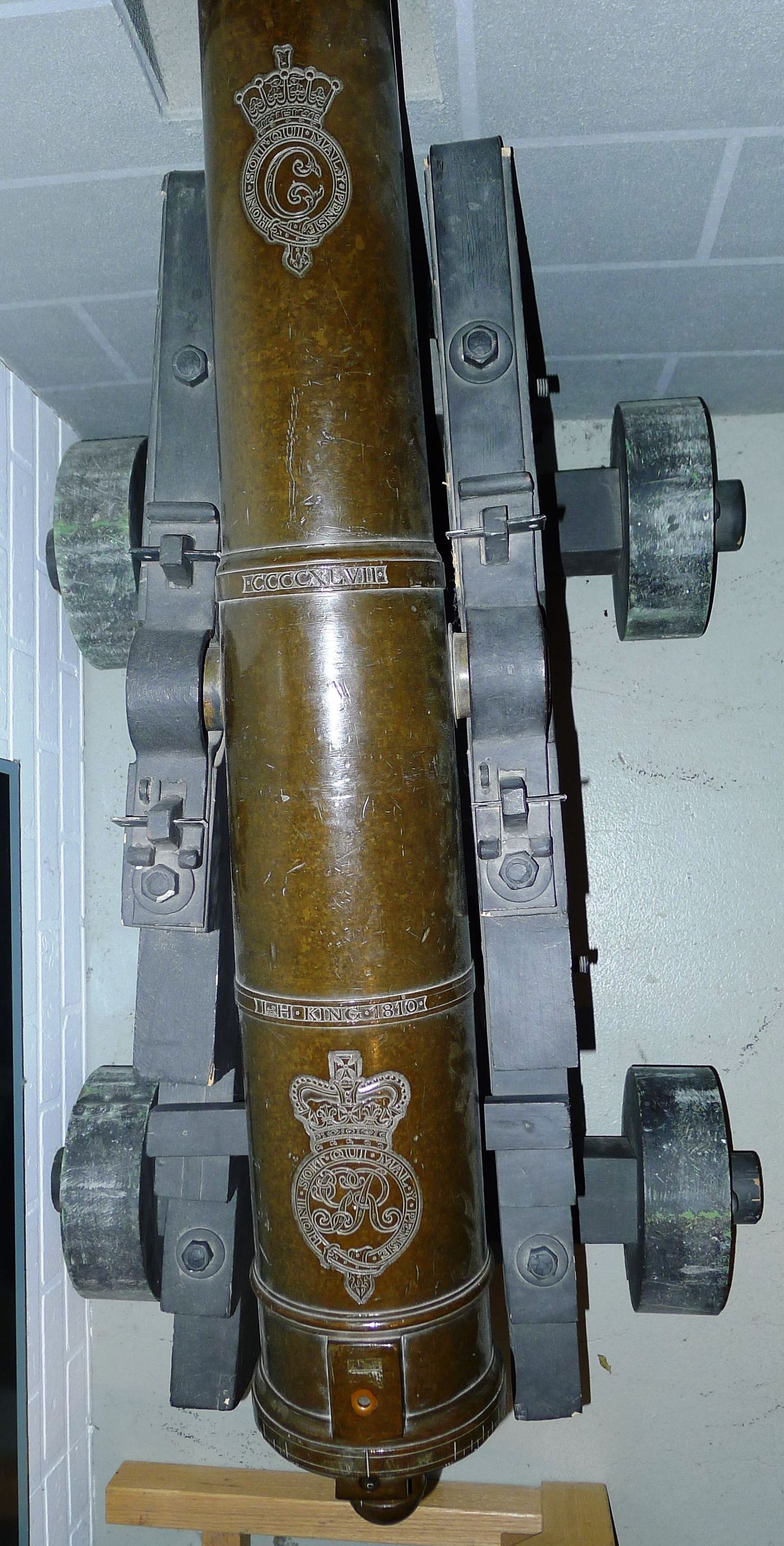 18-pounder 10-cwt Smoothbore Muzzleloading Carronade.  The carronade is a short smoothbore, cast iron cannon, which was used by the Royal Navy and first produced by the Carron Company, an ironworks in Falkirk, Scotland.  It was used from the 1770s to the 1850s.  Its main function was to serve as a powerful, short-range anti-ship and anti-crew weapon.  While considered very successful early on, carronades eventually disappeared as rifled naval artillery changed the shape of the shell and led to fewer and fewer close-range engagements.