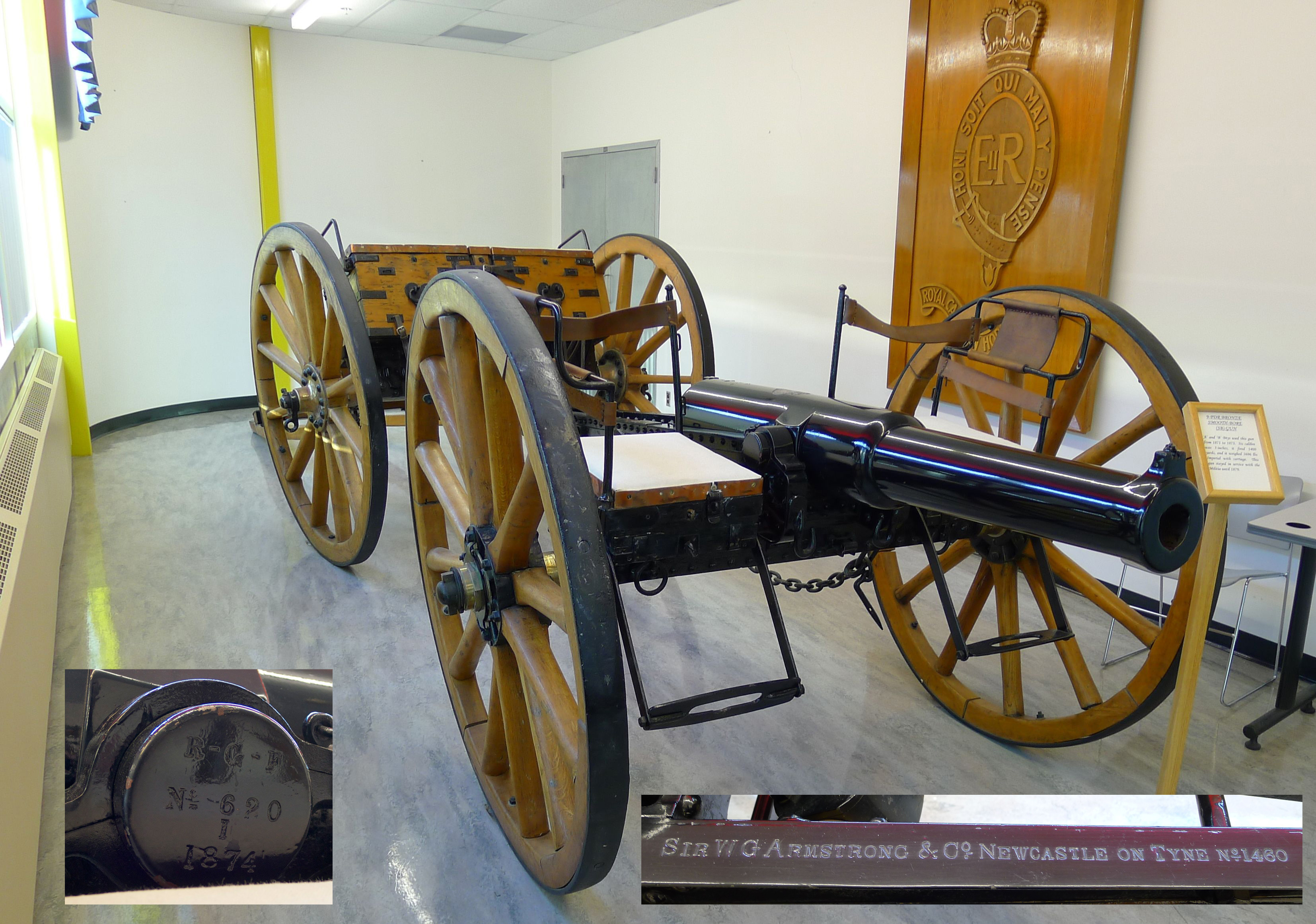 9-pounder 8-cwt Muzzleloading Rifle with Limber, weight 8-1-6 (930 lbs), (RGF No. 620) on the left trunnion, Queen Victoria cypher, broad arrow mark, Serial No. 5791 on the muzzle, mounted on a wood wheeled field carriage, Serial No. 1460,  This gun is on loan from RCMP Depot, and is on display inside the 1 RCHA HQ, 2nd floor.  1 RCHA.