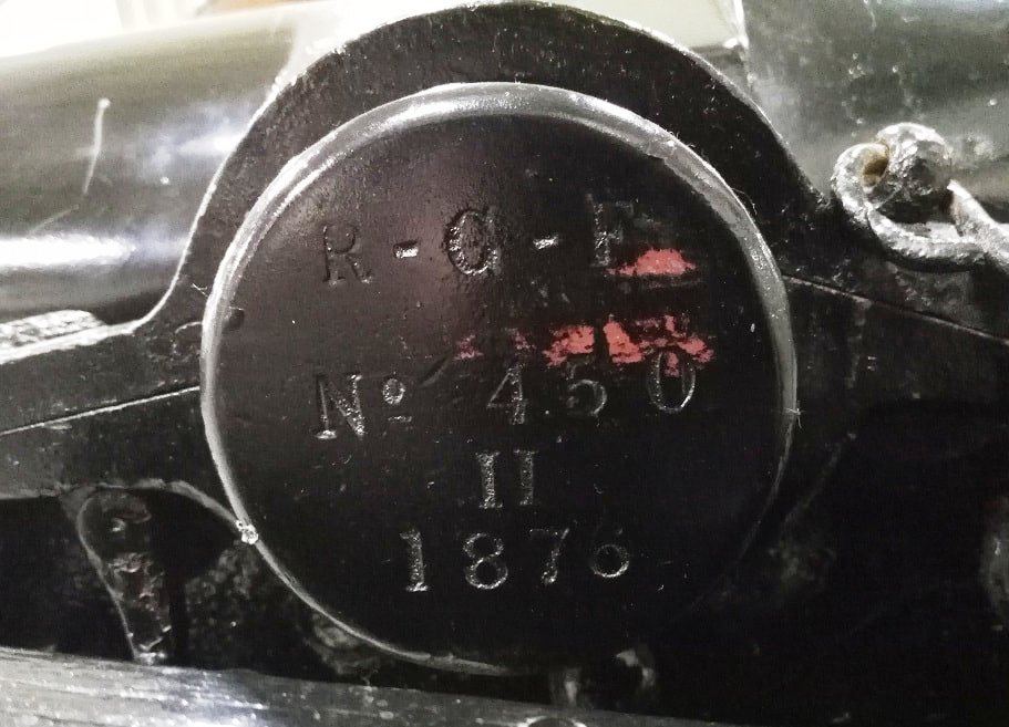 9-pounder 6-cwt Land Service (L.S.) Muzzleloading Rifle, weight 5-3-27 (671 lbs), (RGF No. 450, Mk. II, 1876) on left trunnion, Firth Steel No. 4539 on the muzzle, Queen Victoria cypher, broad arrow mark, mounted on an iron carriage with wood wheels.  This gun was a new design in 1874 for the Royal Horse Artillery.  It was longer than the 8-cwt gun but had the same carriage.  It is on a five year loan to the 15th Field Artillery Regiment Museum & Archives in Vancouver from the RCA Museum.