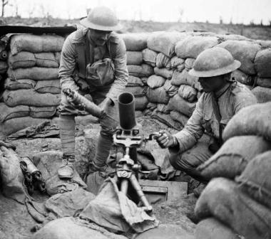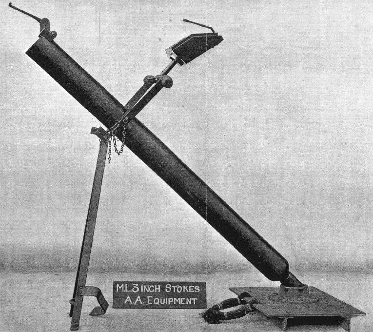 Early in the First World War, the British army did not have trench mortars, but quickly understood their value and began to develop an equivalent.  In mid-1915 the 3-inch Stokes mortar was accepted for service in the infantry.  The artillery operated a 2-inch medium “toffee apple” mortar and 9.45-inch heavy mortars.  The 2-inch mortar was replaced with the 6-inch Newton mortar in 1917.