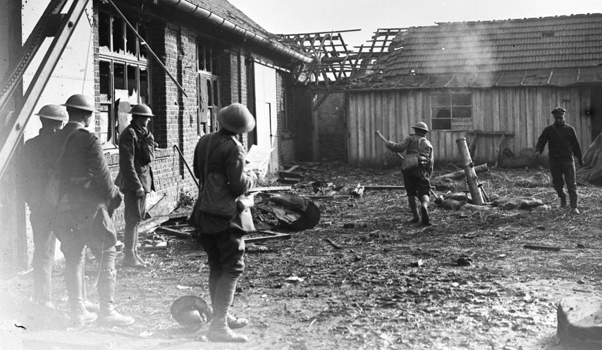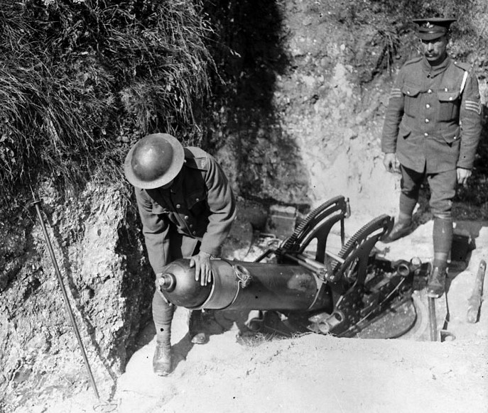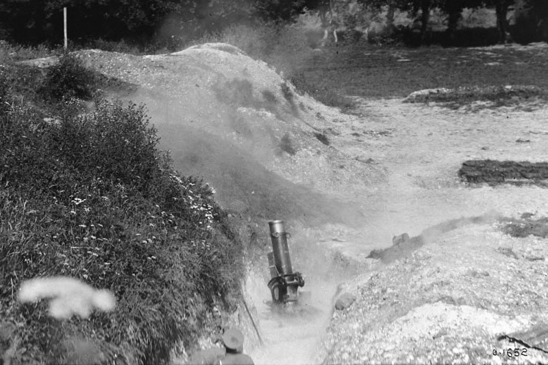 6-inch Newton Trench Mortar being fired by Canadian troops at Valenciennes, France, 1918.