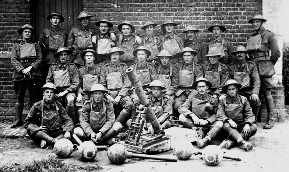 ‘Z.C. Trench Mortar Battery’ France ‘Suicide Club’ after the Battle of Lens, Lieutenants. J.A. McGibbon and B.E. Scott, M.C. with a Canadian trench mortar battery equipped with a 2-inch Muzzleloading Trench Howitzer (The “Toffee Apple” Mortar).  The designation “2-inch” refers to the mortar barrel, into which only the 22-inch bomb shaft but not the bomb itself was inserted; the spherical bomb itself was actually 9 inches (230-mm) in diameter and weighed 42 lb (19 kg), hence this weapon is more comparable to a standard mortar of approximately 5-6 inch bore.