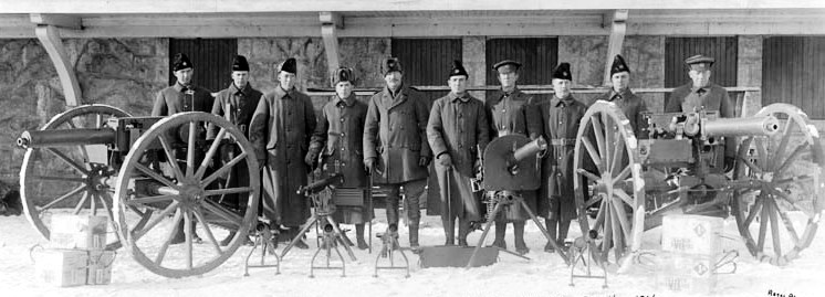 1-pounder QF Mk. I (Maxim) Gun, V.S.M. (Vickers, Sons & Maxim Limited) 1904, Automatic Guns, Captain Wheatley and Sub Staff of Machine Gun School, M.D. 10, Winnipeg, Manitoba, 16 Dec 1916.