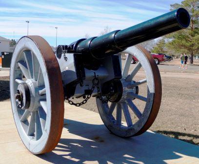Armstrong 40-pounder 35-cwt Rifled Breech-loading Gun, 1867, CFB Shilo Gym.  This gun with a 4.75 inch calibre, was a naval and fortification gun in use from 1860 to the early 1900s.  The guns were typically employed mounted on high “siege travelling carriages” for use as semi-mobile guns in forts, firing over parapets.  Many were mounted on travelling carriages and used by many Volunteer Artillery Batteries to whom they were issued after 1889.  Most remained in use in this role until 1902. A number were used for some years afterwards as saluting guns.  One other Armstrong 40-pounder 35-cwt Rifled Breech-loading Gun is on display in the Canadian War Museum, Ottawa, Ontario.