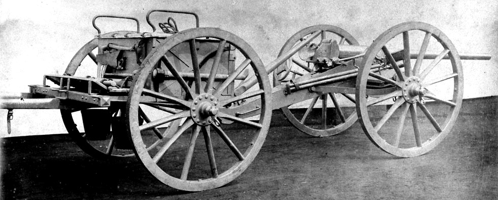 Nordenfelt 6-pounder QF Gun mounted on a wheeled carriage.  This type of gun was also used in the coastal defence role.  Photo c1900.