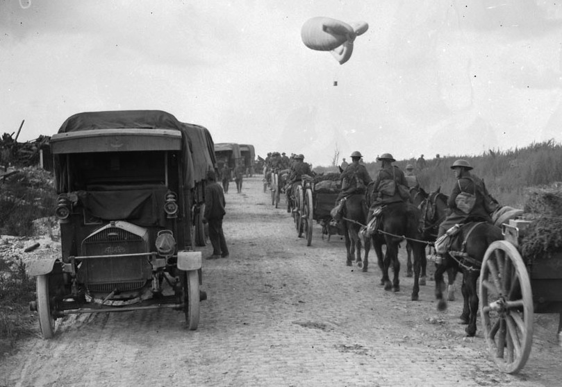 Canadian Artillery passing an Observation Balloon which is being brought down. Advance East of Arras. September, 1918.