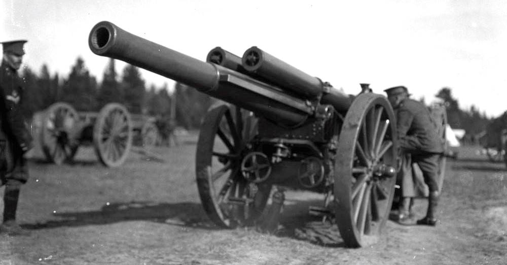 8-inch Breechloading Mk. VI Howitzer M1917 at full recoil, Oct 1917.