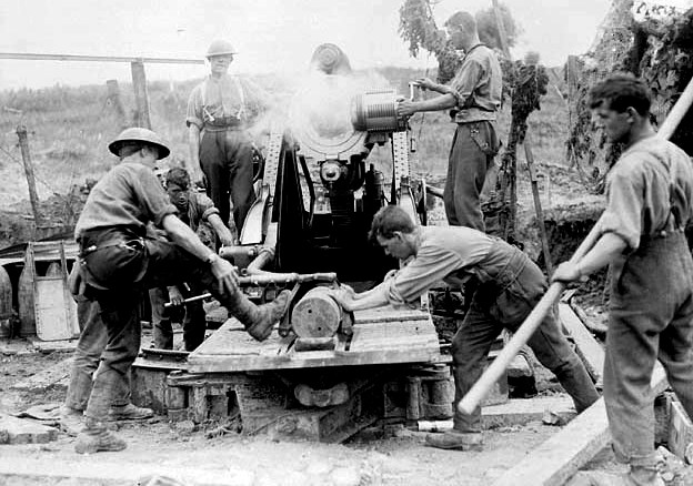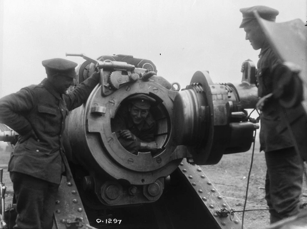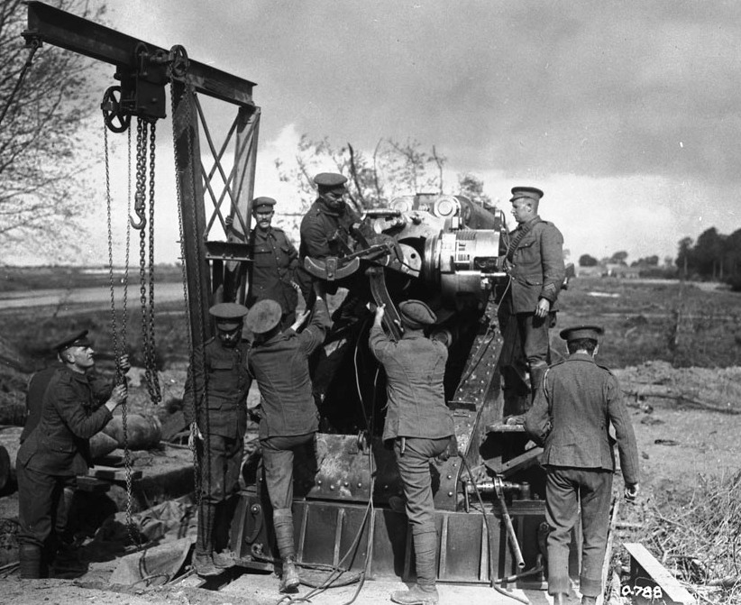 9.2-inch Breechloading Mk. I Howitzer on a Mk. I Carriage being loaded, Sep 1916.  The shell weighed 290 lbs (130 kgs).  The steel box the howitzer rests on was filled with about 9 tons of earth to stabilize the mounting can be seen behind the gunner holding the hand wheel on the right.  Two Canadian batteries used these guns in France.