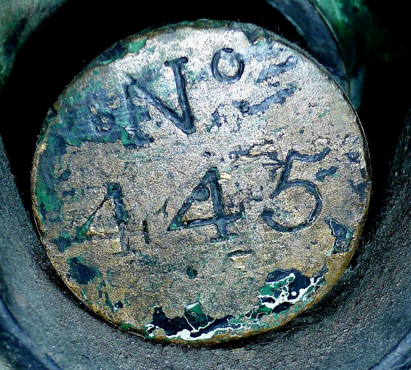 Bronze3-pounder 3-cwt Smoothbore Muzzleloading Gun, weight 2-2-27 (307 lbs) (J. &H. King, 1810) and CCCCXLV (445) on the chase, blank on the left trunnion, (Serial No. 445) on right trunnion, General John Pitt, 2nd Earl of Chatham, Master General of the Ordnance 1801–1806  and 1807–1810, cypher on the barrel, above the King George III cypher, mounted on a wood Naval Gun carriage.  This gun was with the Hudson’s Bay Company.  No. 1 of 2.