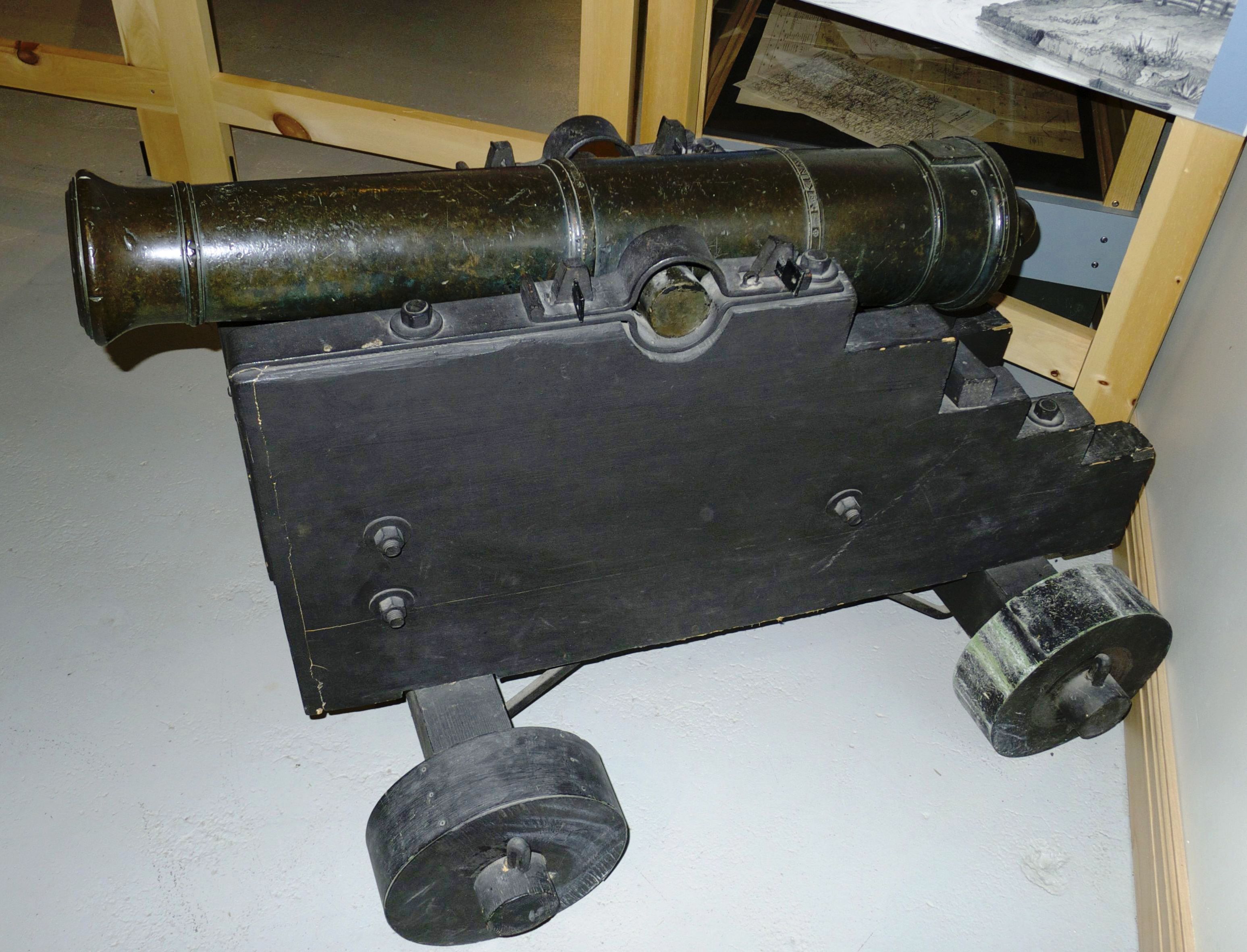 Bronze 3-pounder 2-cwt Smoothbore Muzzleloading Gun, weight 2-0-14 (238 lbs), (F. Kinman, 1812) on the chase (Francis Kinman at Woolwich, England), (Serial No. 447) on right trunnion, 3-inch bore, length 36 inches, mounted on a wood Naval Gun carriage.  Hudson’s Bay Company gun with spiked vent. No. 2 of 2.