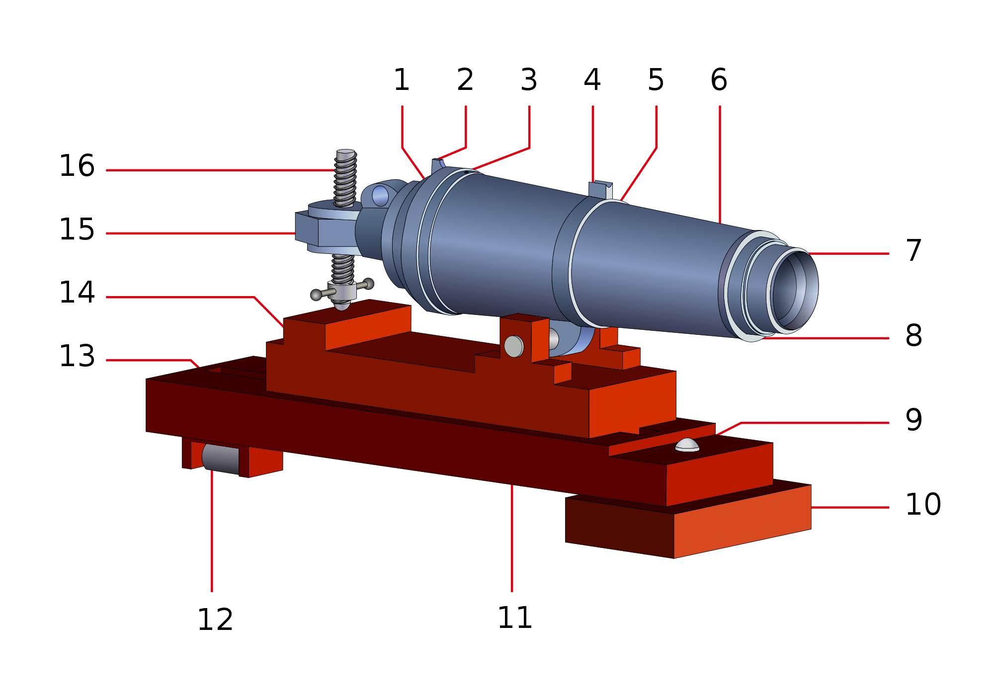 Vector representation of an Model 1805 Carronade: 1. Breech bolt, 2. Aft sight, 3. Vent hole, 4. Front sight, 5. First reinforcing ring, 6. Barrel ,7. Muzzle, 8. Second reinforcing ring, 9. Azimutal pivot, 10. Chock, 11. Elevation pivot, 12. Wheel, 13. Mobile pedestal, 14. Carriage, 15. Pommel, 16. Elevation thread.  Delaby Pierre (Walké)
