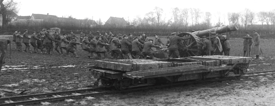 12-inch Naval Howitzer, mounted on a railway platform, Nov 1917.