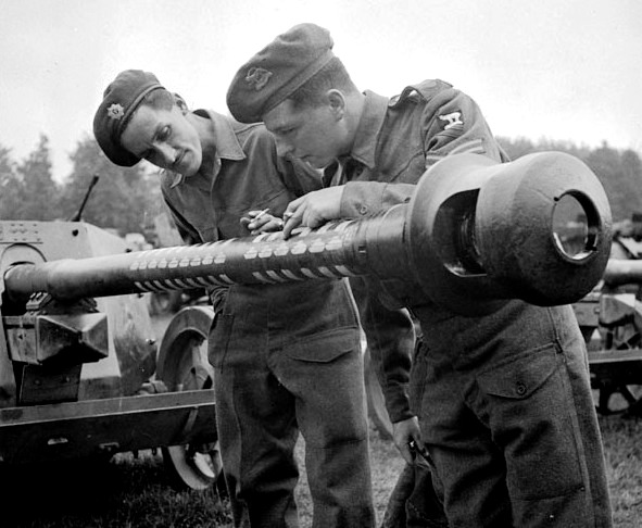 Canadian soldiers examining a captured 7.5-cm PaK 40 Anti-Tank Gun marked with 15 kill rings, ca. 1945.