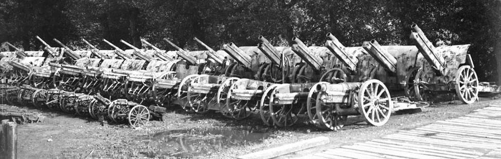 German Artillery, trench mortars and machine guns captured by Canadians, East of Arras, France, Sep 1918.