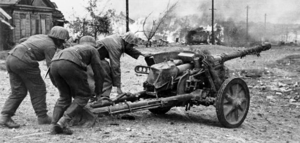 German soldiers prepare a 55-cm PaK 38 (L/60) Anti-Tank Gun for action in the outskirts of Stalingrad. Near Stalingrad (now, Volgograd), Volgograd Oblast, Russia, Soviet Union. September 1942. (Wehrmacht Photo)