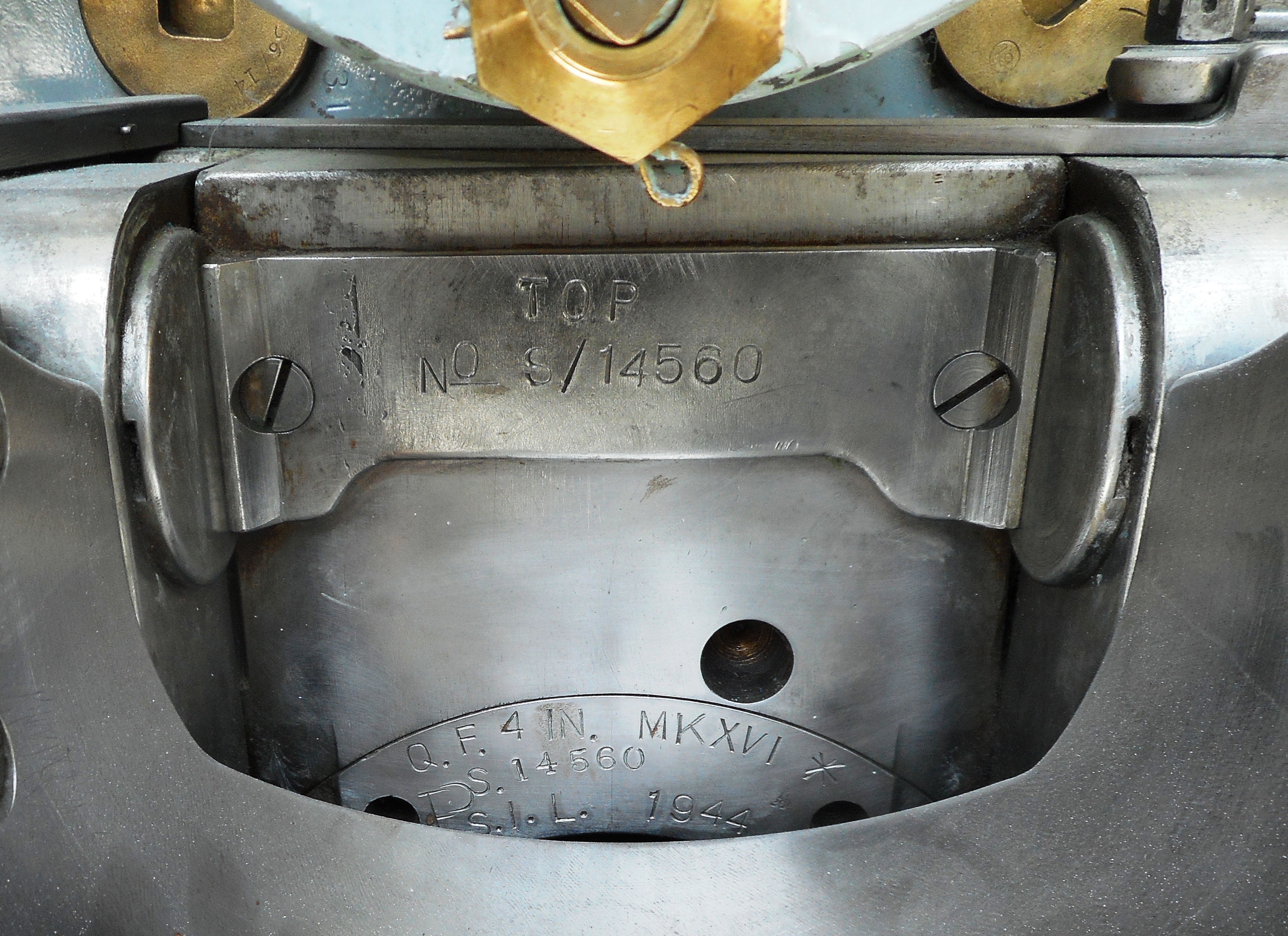 4-inch/45 QF Mk. XVI* Twin Guns SIL 1944 (Serial No. S/14559), L, left, and (Serial No. S/14560), R, right, on a Mk. XIX High Angle mounting (Serial No. 146), located in the front lobby, 1 Navy Way.