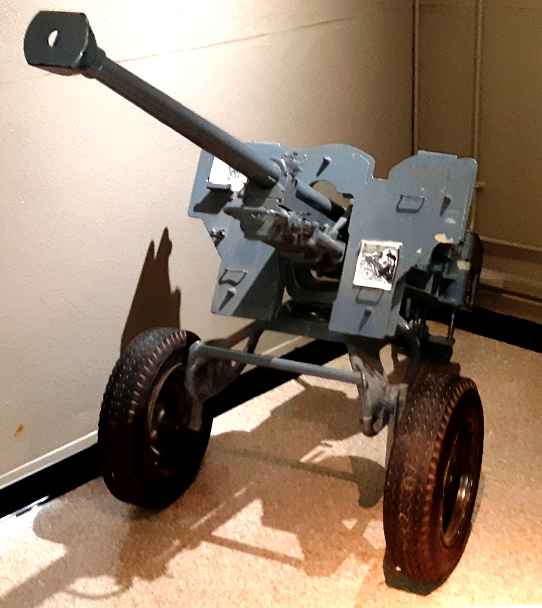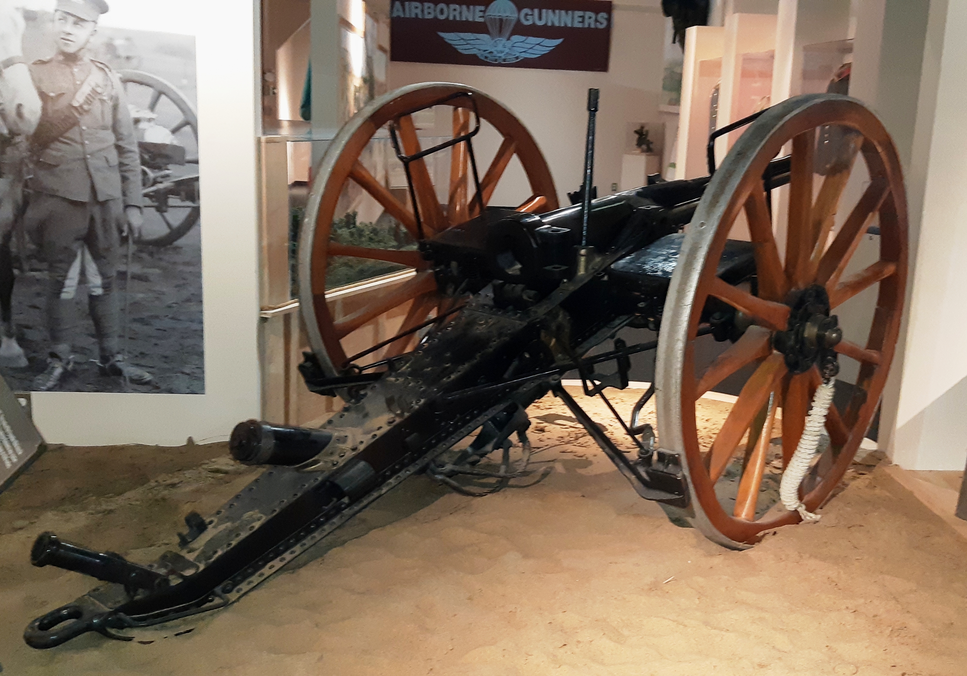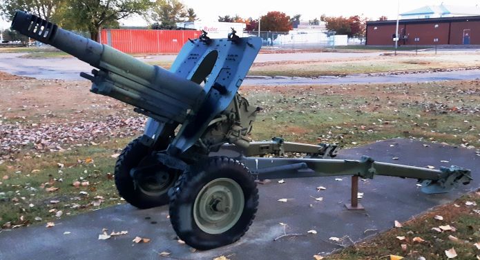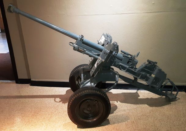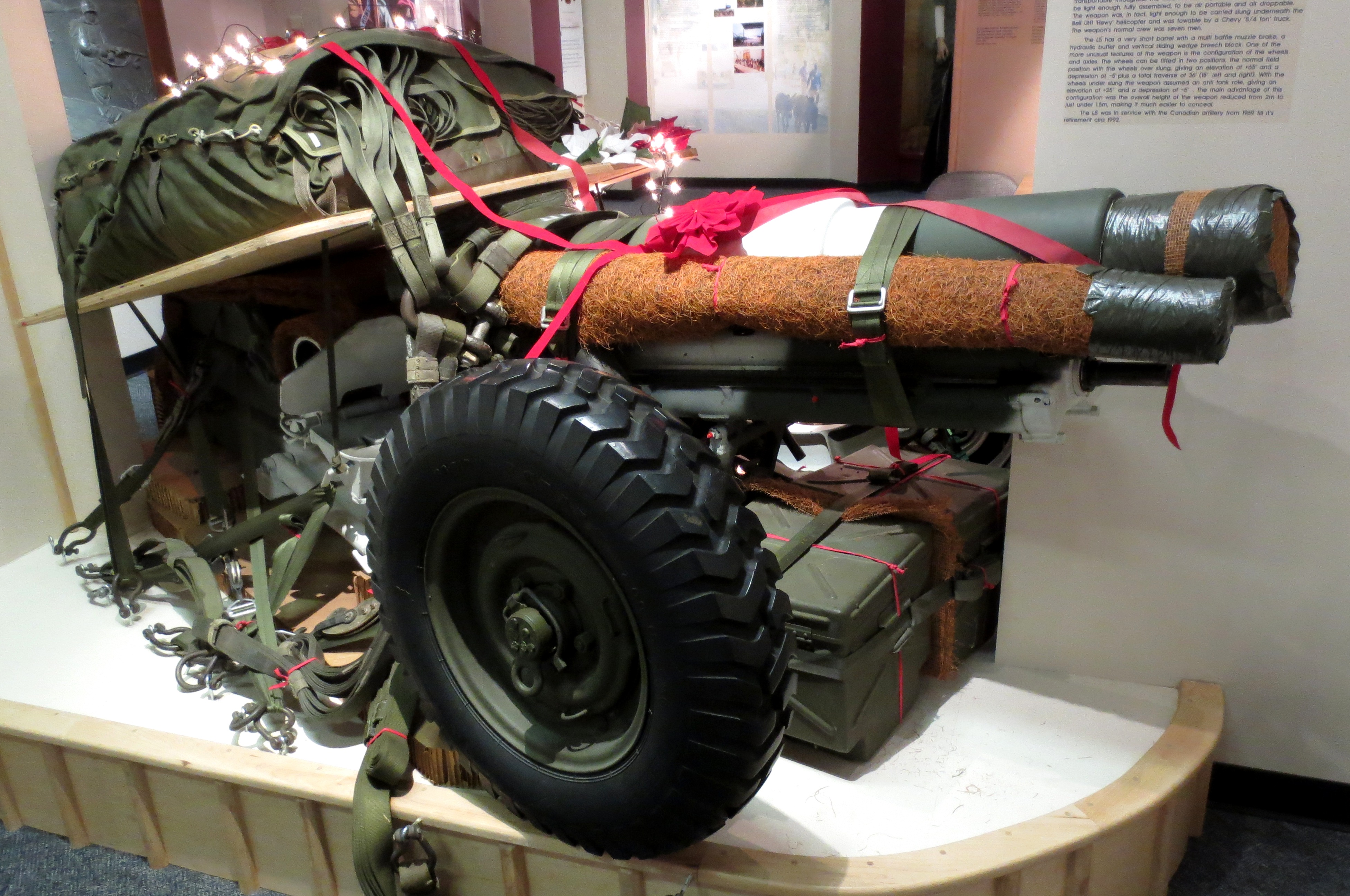 105-mm L5 Pack Howitzer,  rigged for a parachute drop, inside the Base Museum.