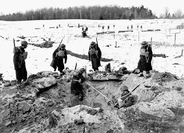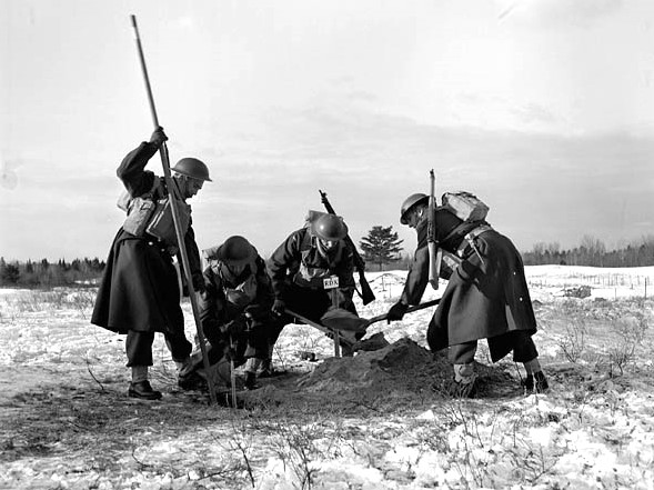 Members of a demolition squad fill an eight-foot deep hole planted with 90 pounds of RDX explosives before a field test at Camp Petawawa, March 1944.