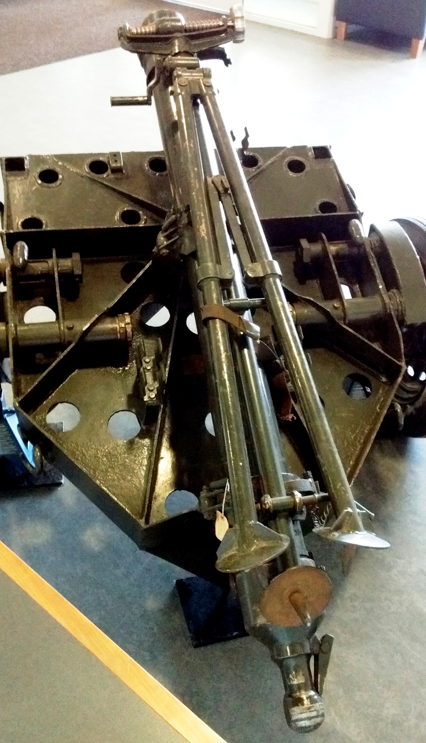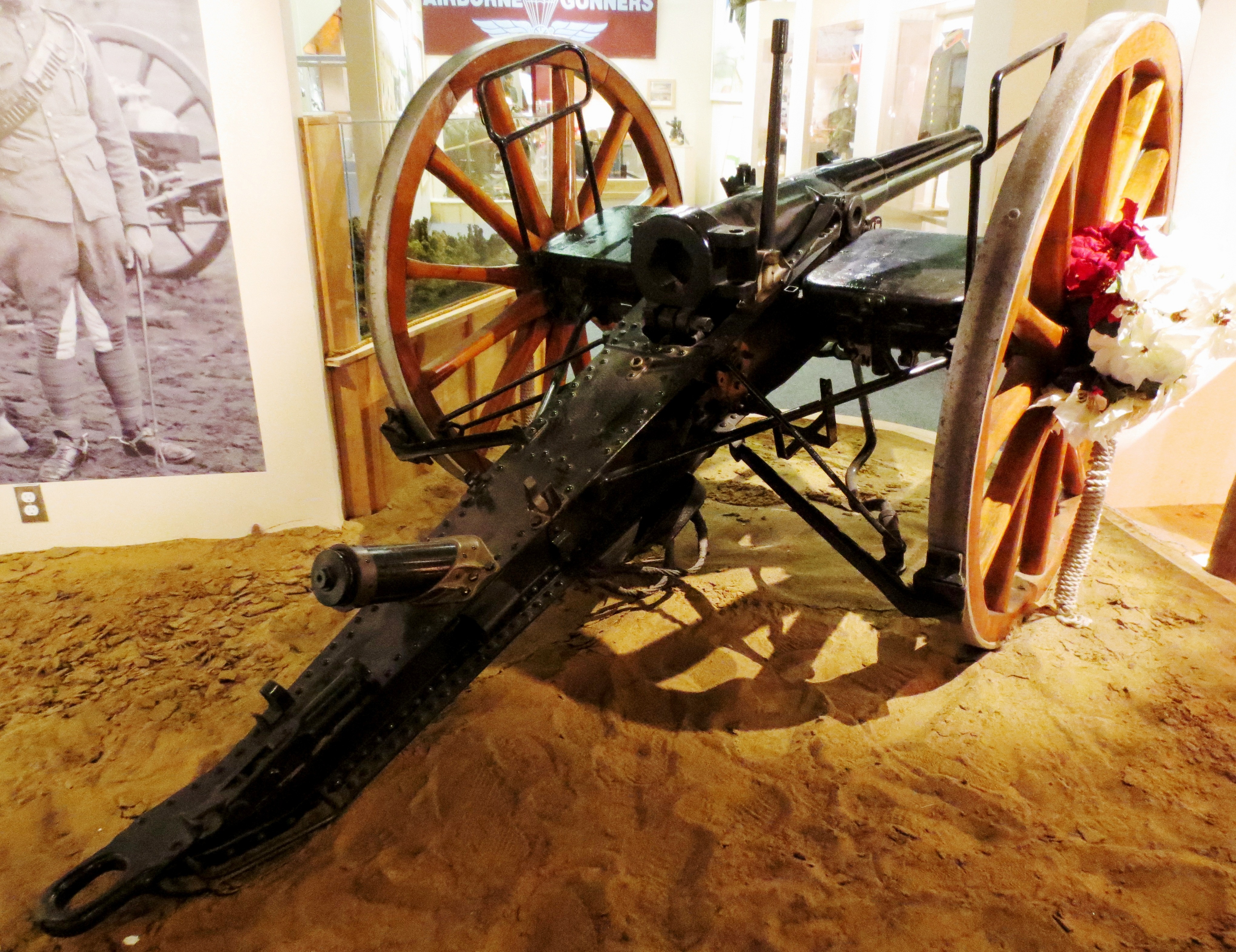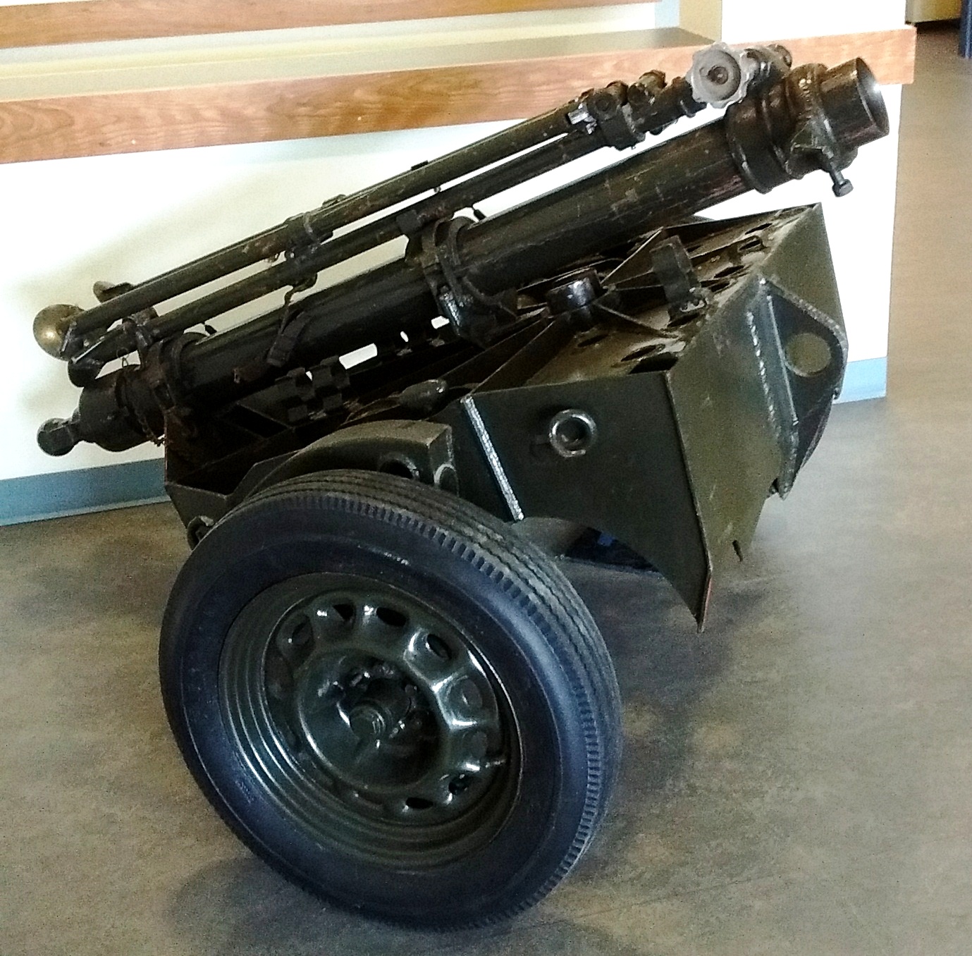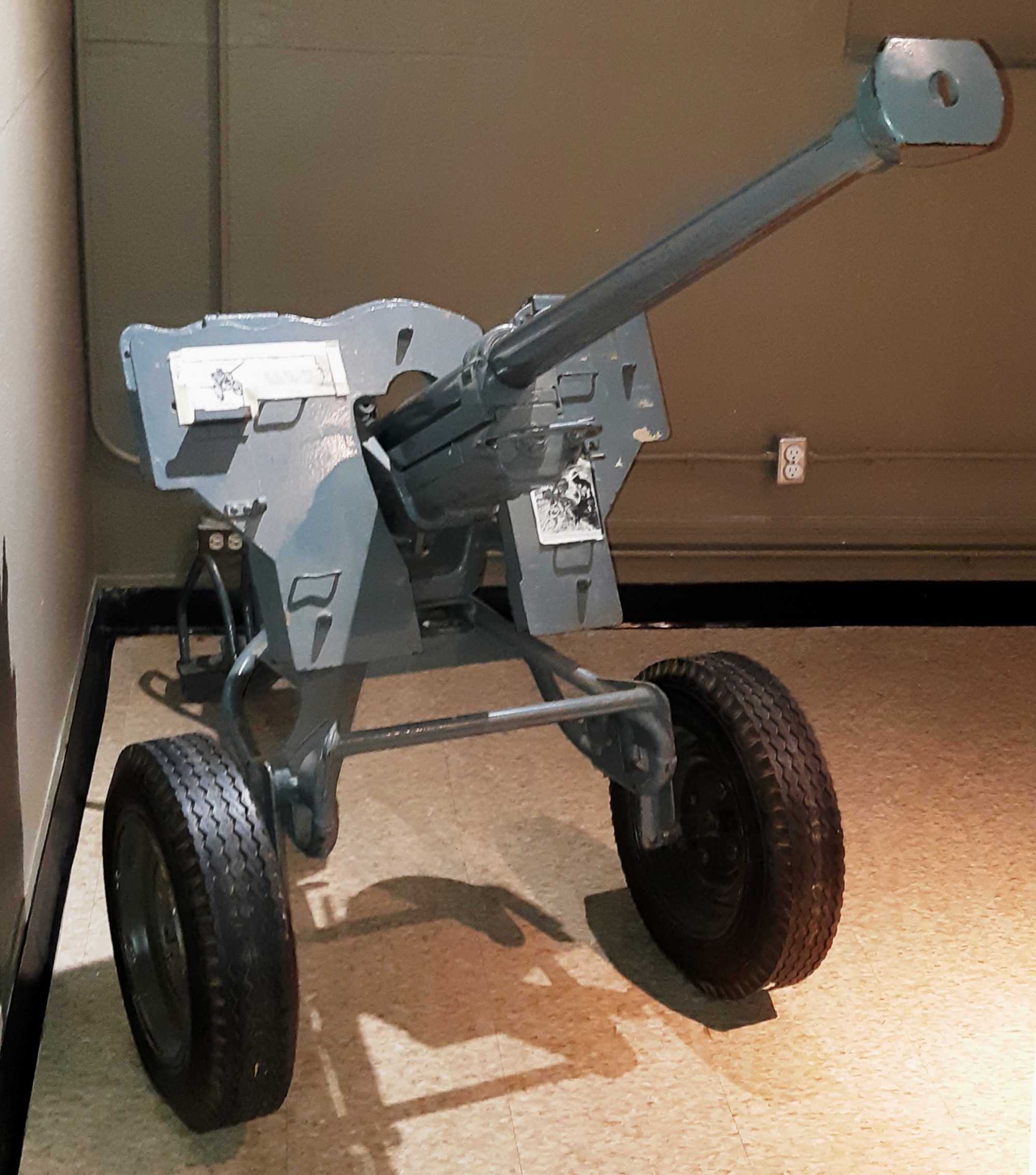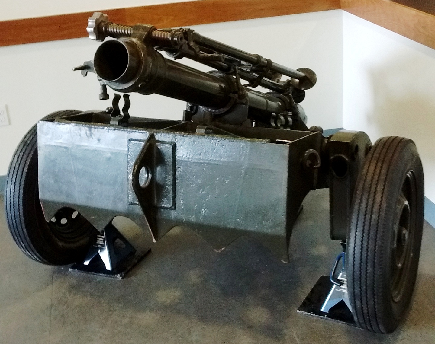 British 4.2-inch Smoothbore Mortar Mk. II with wheeled baseplate, located in the lobby of the main transient quarter on Base.