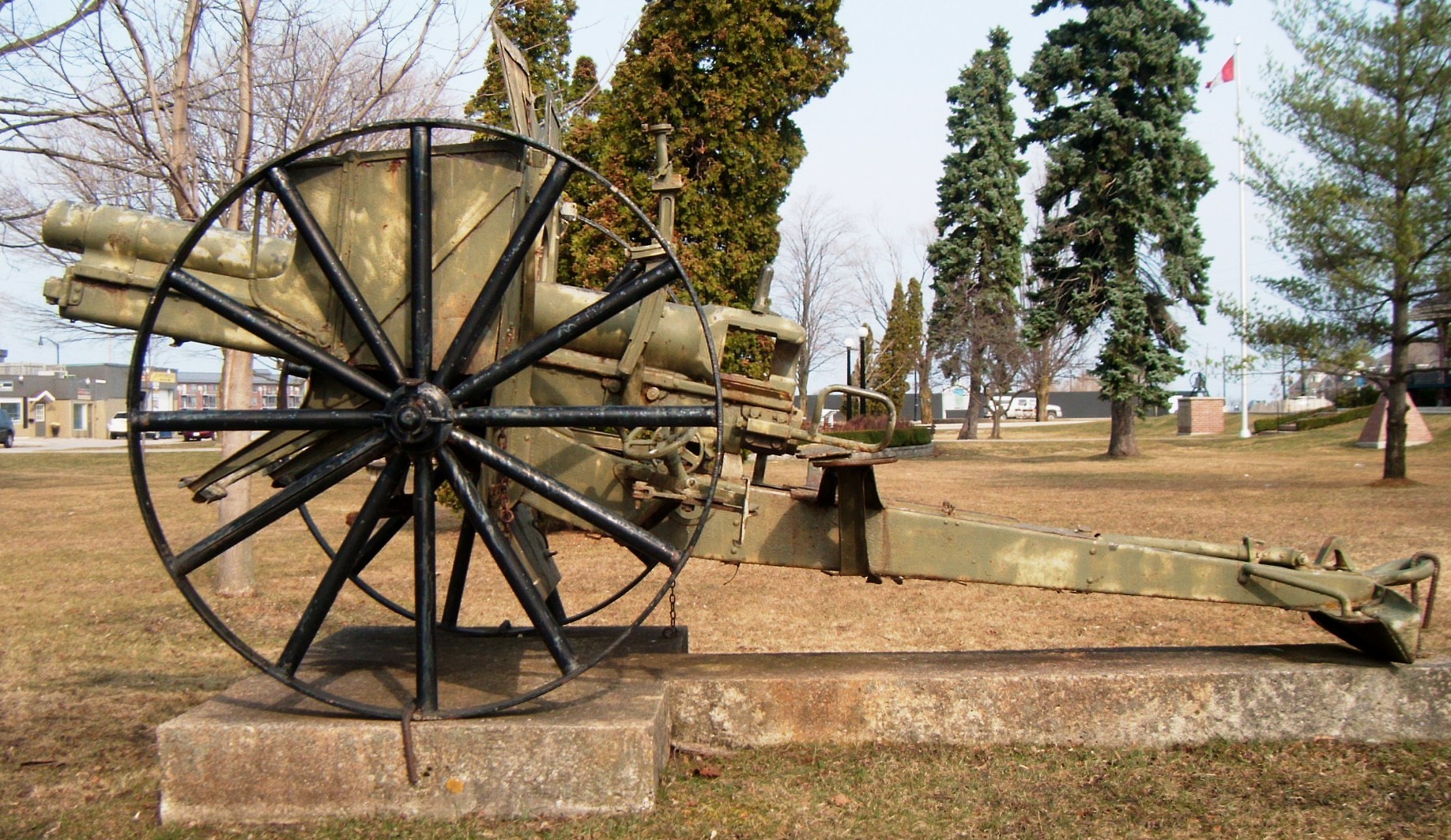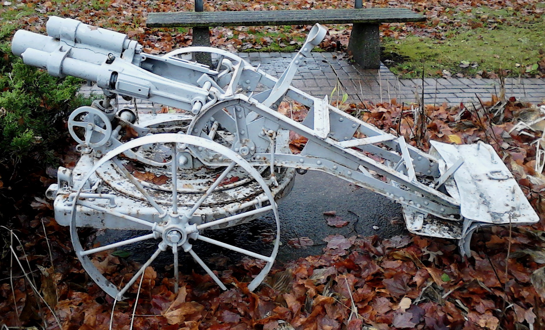 German First World War 7.58-cm leichtes Minenwerfer neuer Art (7.58-cm leMW), (Serial Nr. 16214), mounted on a round iron stand at the cenotaph.  This trench mortar was captured by the 102nd Battalion near Beaucourt Wood, NW of Les Quesnel on 8 August 1918.