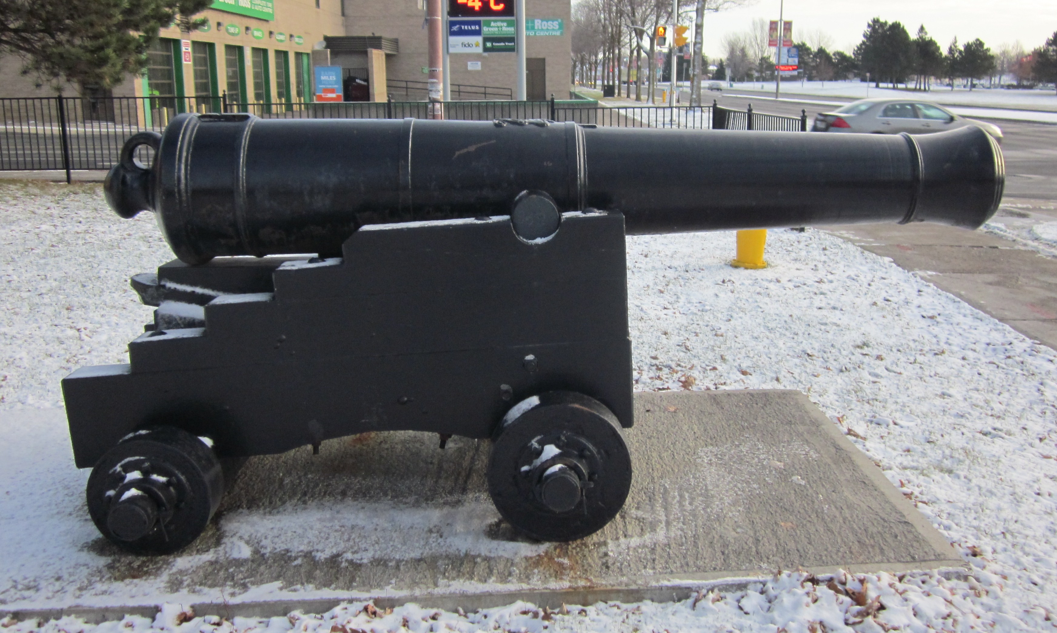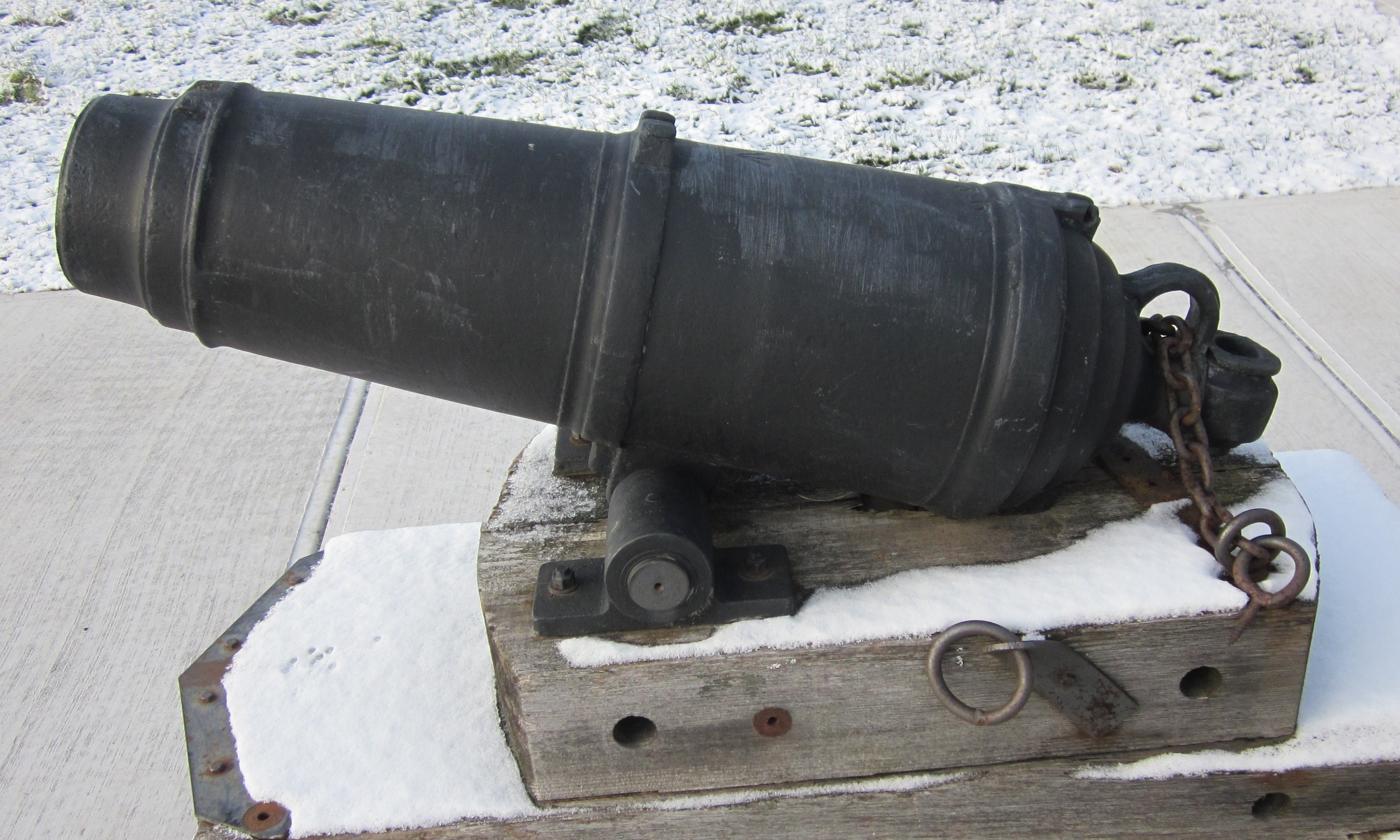 Blomefield Cast Iron 32-pounder 56-cwt Smoothbore Muzzleloading Gun, weight 56-1-11 (6,311 lbs), (Serial No. 70502, CARRON, 1806) on left trunnion, (32P) on right trunnion, King George III cypher, broad arrow mark, mounted on a concrete stand.  Royal Canadian Legion Branch No. 63.