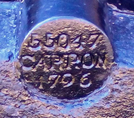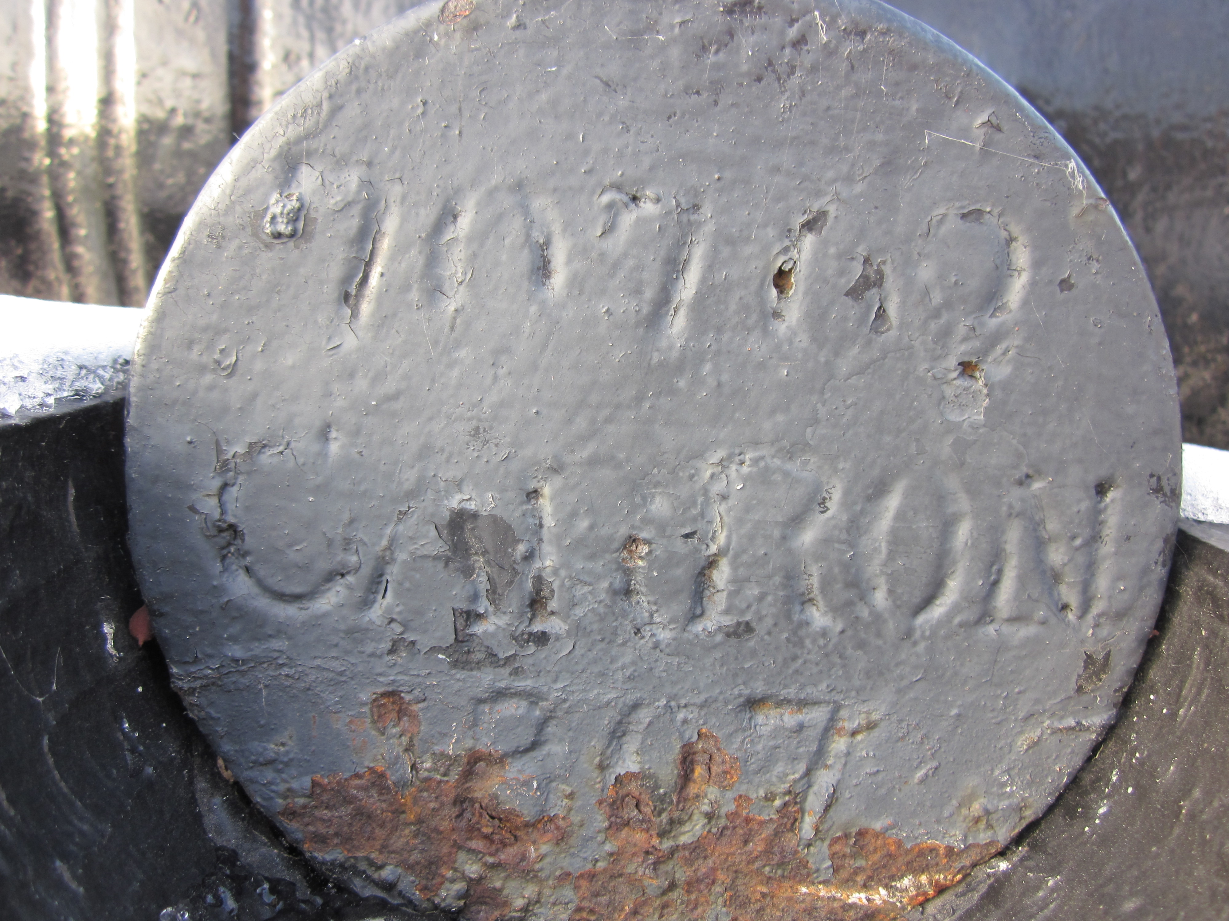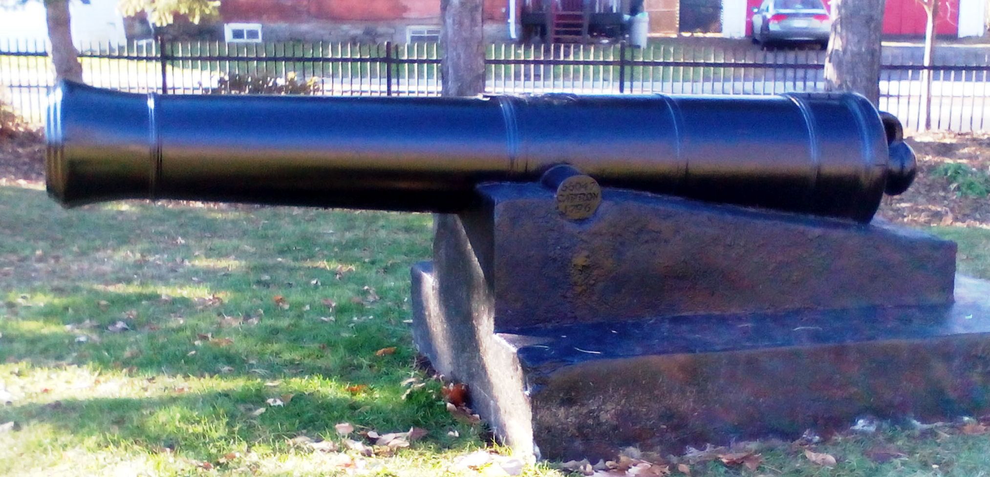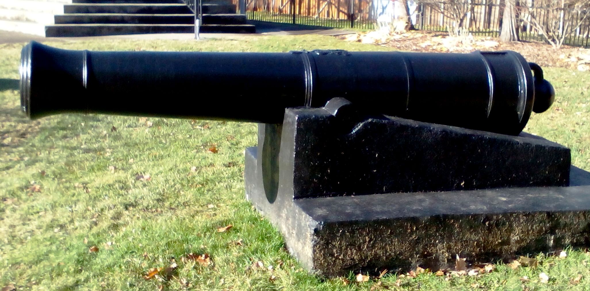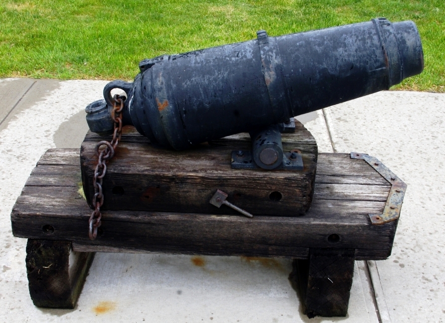 Blomefield Cast Iron 32-pounder 56-cwt Smoothbore Muzzleloading Gun, weight >6,000 lbs, (Carron Serial No. 55047, 1796) on left trunnion, (32P) on right trunnion, George III Cypher, mounted on a concrete stand.  Weight markings are embedded in concrete stand.  This gun is located on the west side of the cenotaph in the Veterans Memorial Park at 2nd St W and Bedford St.