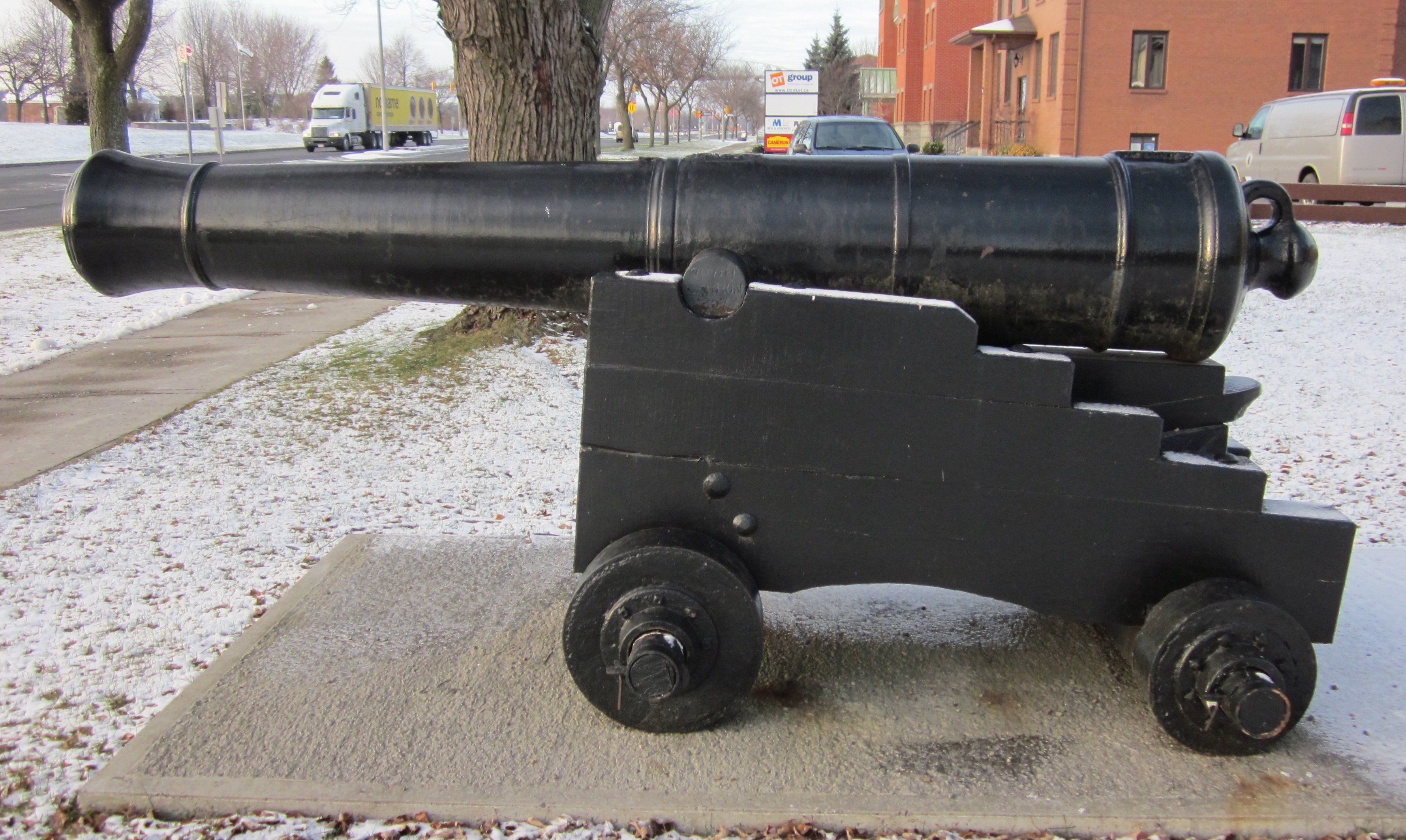 Blomefield Cast Iron 32-pounder 56-cwt Smoothbore Muzzleloading Gun, weight 55-3-14 (6,258 lbs), (WCo) (Walker & Company) on left trunnion, (Serial No. 197) on right trunnion, King George III cypher, broad arrow mark, mounted on a concrete stand.  Royal Canadian Legion Branch No. 63, 490 Ontario Street.