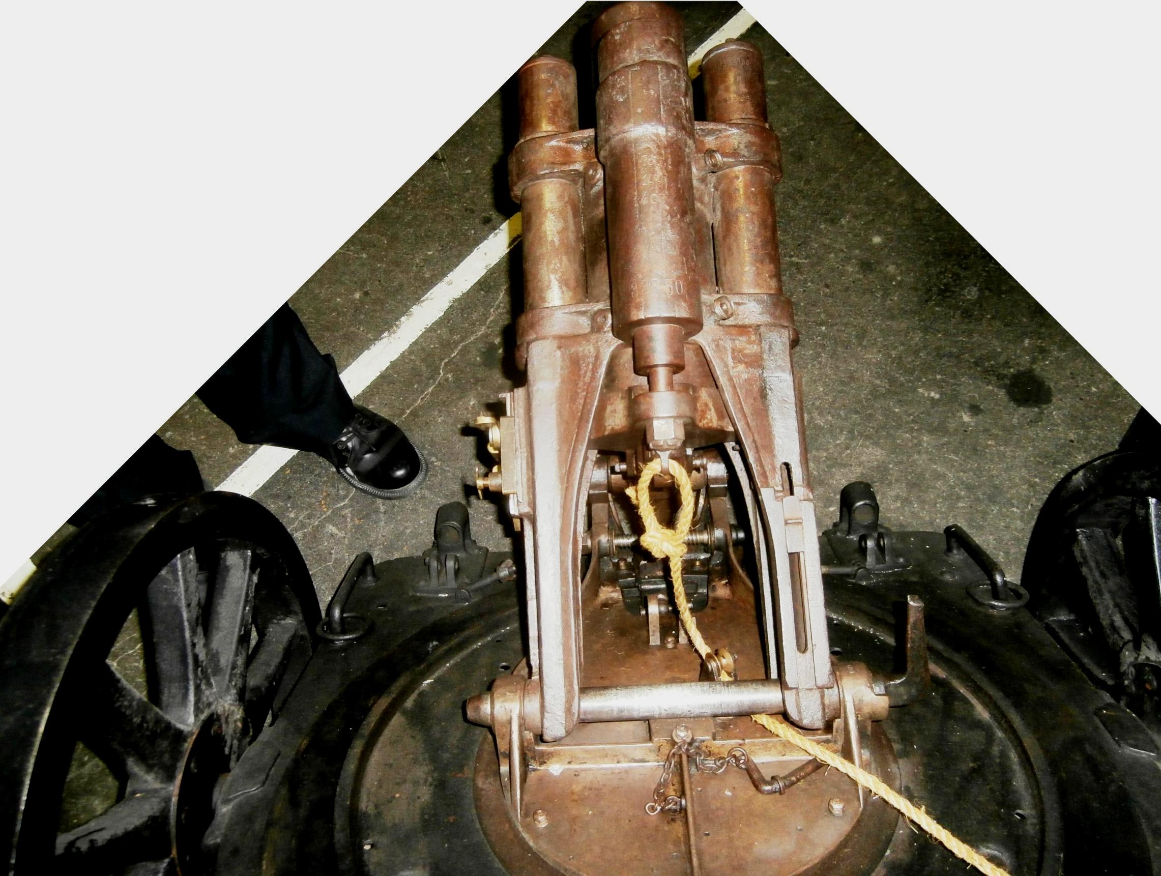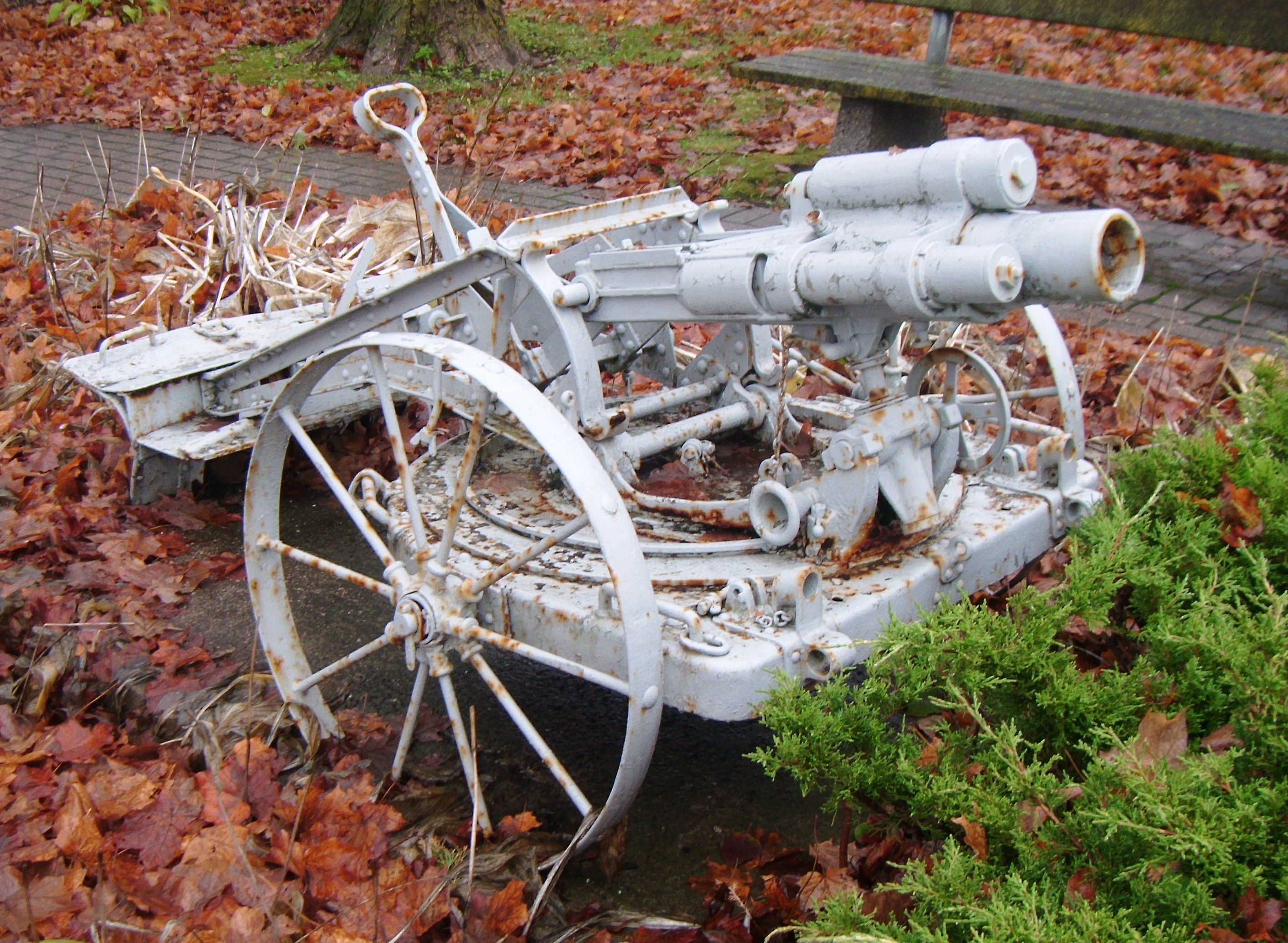 The 7.58 cm Minenwerfer a.A. (alter Art or old model) (7.58 cm leMW).  The Germans fielded a whole series of mortars before the beginning of the First World War.  Their term for them was Minenwerfer, literally mine-thrower; they were initially assigned to engineer units in their siege warfare role.  By the Winter of 1916-17, they were transferred to infantry units where the leMW’s light weight permitted them to accompany the foot-soldiers in the advance.  In common with Rheinmetall’s other Minenwerfer designs, the leMW was a rifled muzzle-loader that had hydraulic cylinders on each side of the tube to absorb the recoil forces and spring recuperators to return the tube to the firing position.  It had a rectangular firing platform with limited traverse and elevation.  Wheels could be added to ease transportation or it could be carried by at least six men.  In 1916, a new version, designated as the n.A. or neuer Art, was fielded that included a circular firing platform, giving a turntable effect, which permitted a full 360 degree traverse.  It also had a longer 16 inches (410 mm) barrel and could be used for direct fire between 0° and 27° elevation if the new 90 kg (200 lb) trail was fitted to absorb the recoil forces.  In this mode it was pressed into service as an anti-tank gun.