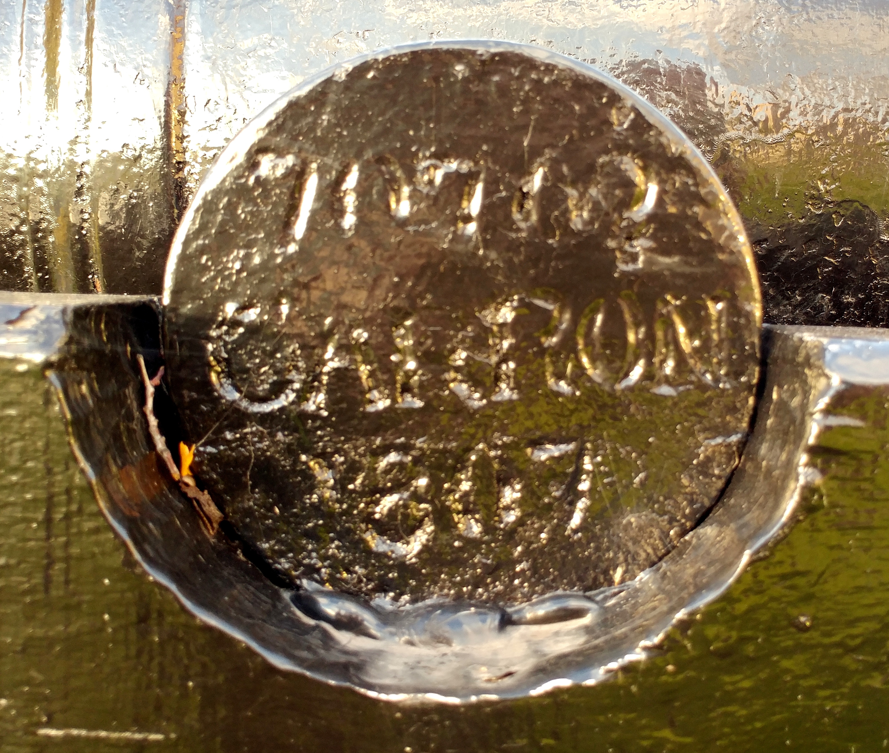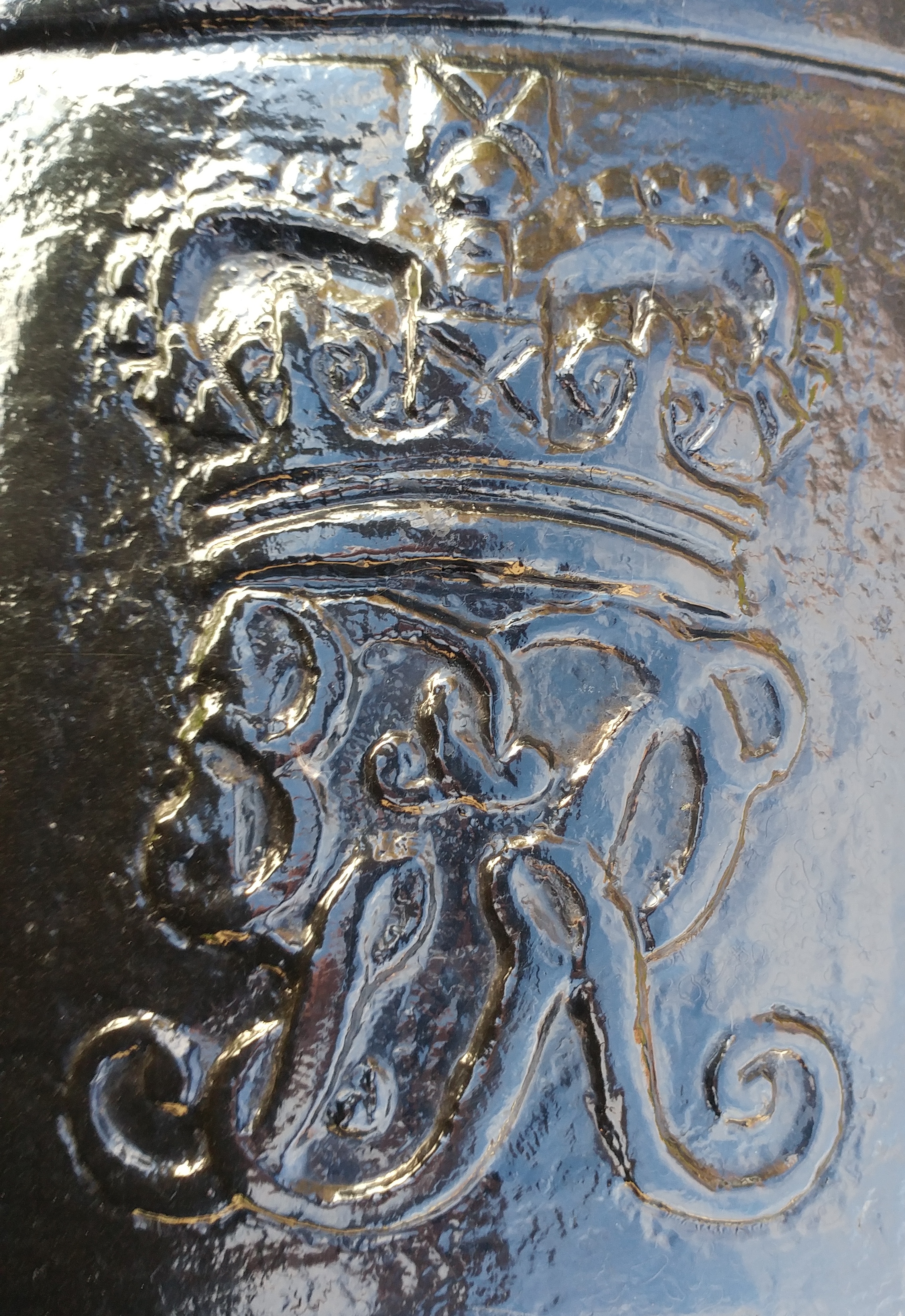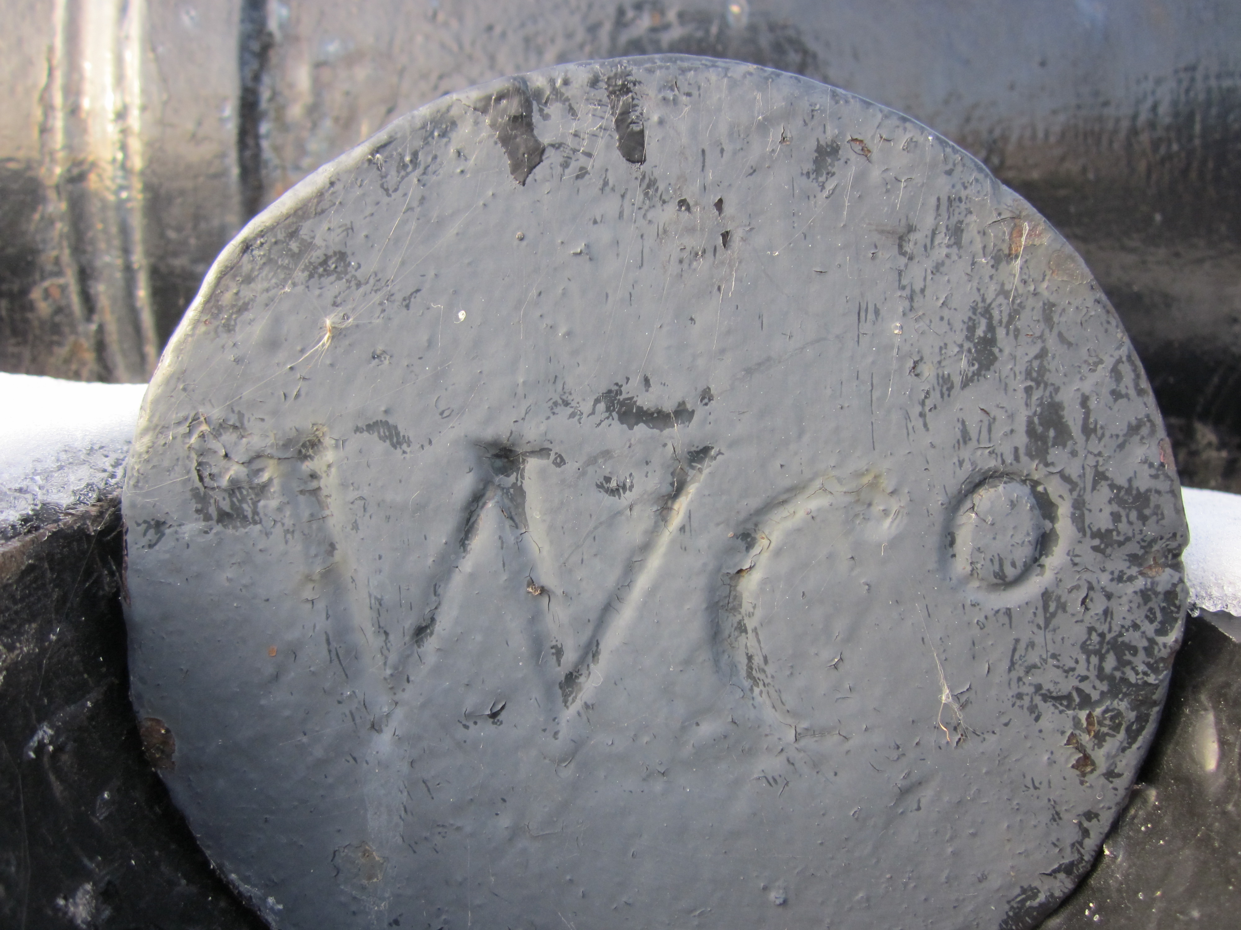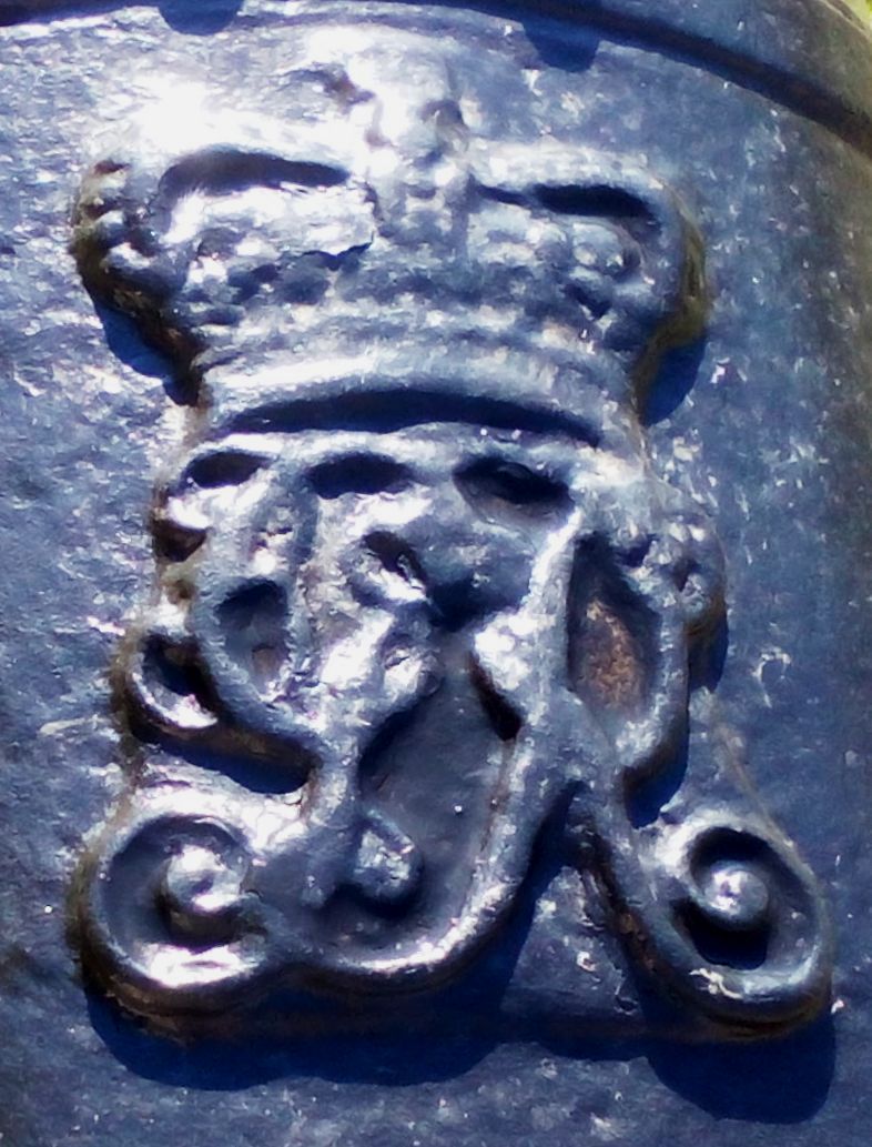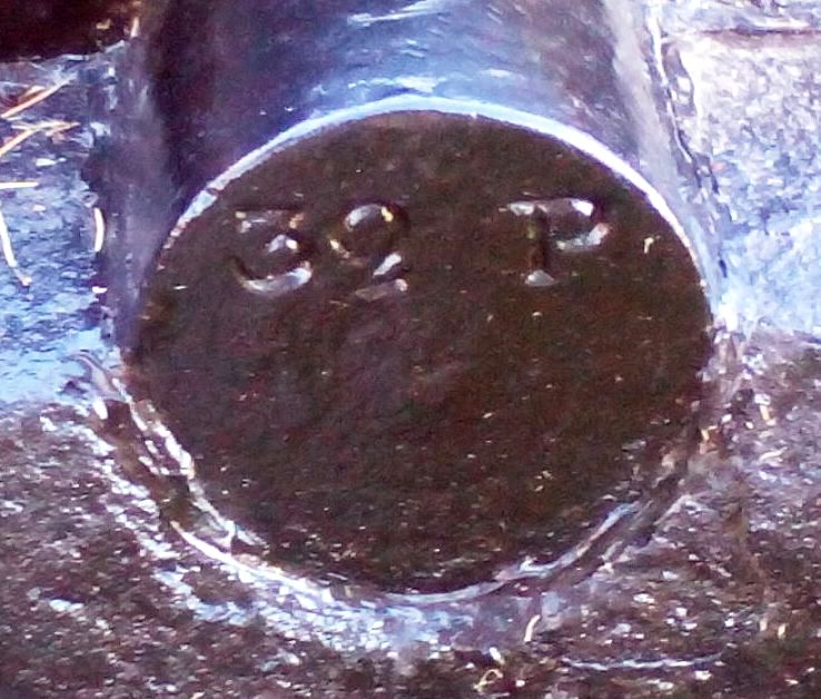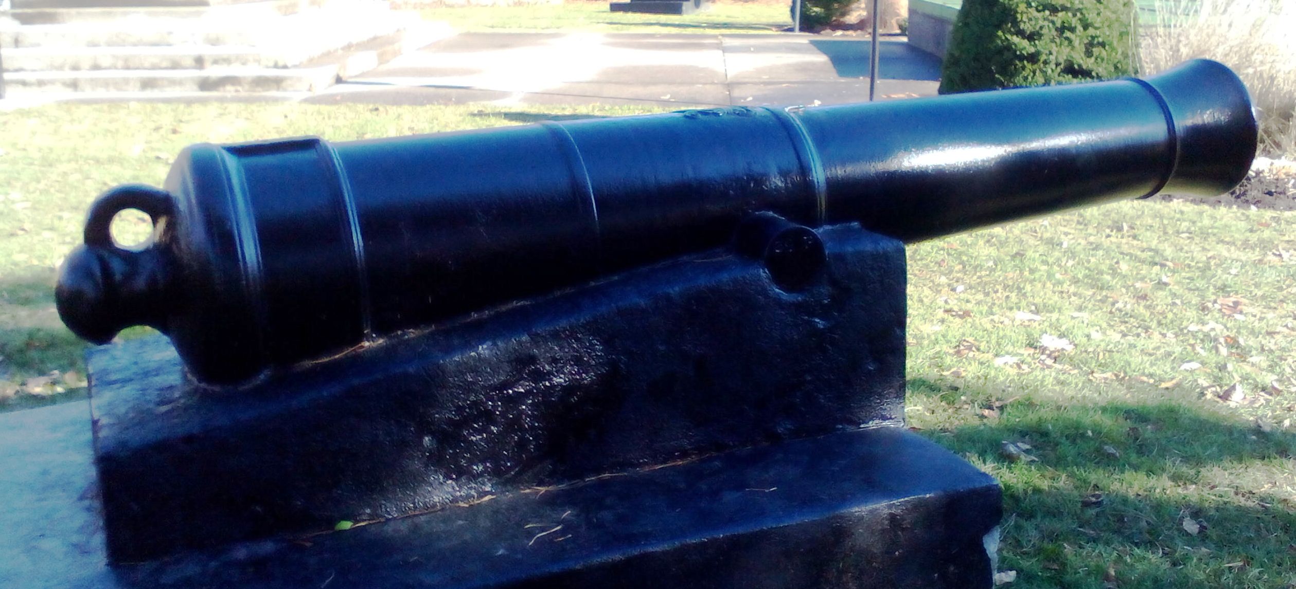 Blomefield Cast Iron 32-pounder 56-cwt Smoothbore Muzzleloading Gun, weight >6,000 lbs, (WCo) Walker &Company on left trunnion, (Serial No. 371) on right trunnion, George III Cypher, mounted on a concrete stand.  Weight markings are embedded in concrete stand.  This gun is located on the east side of the cenotaph in the Veterans Memorial Park at 2nd St W and Bedford St.