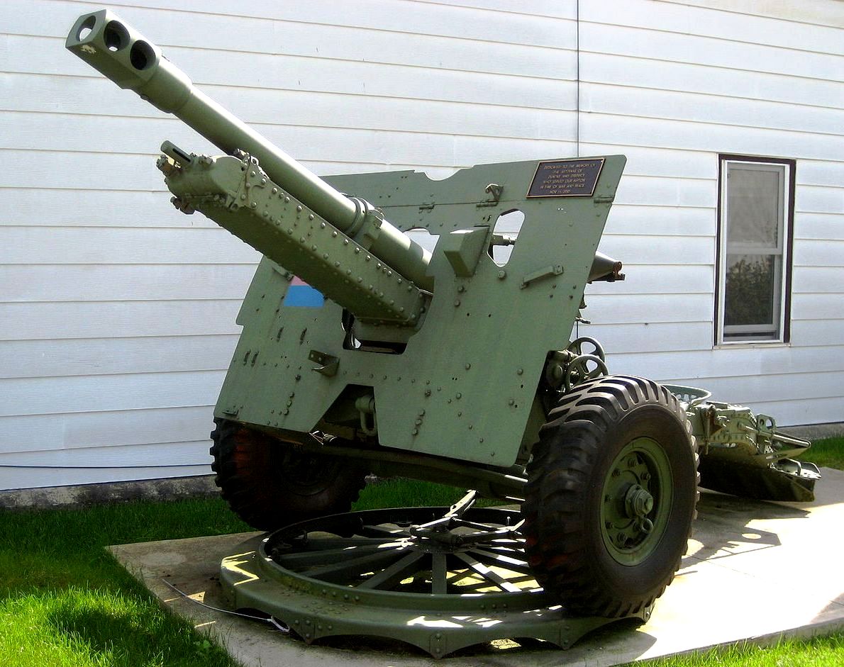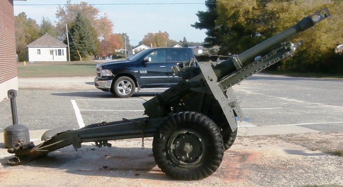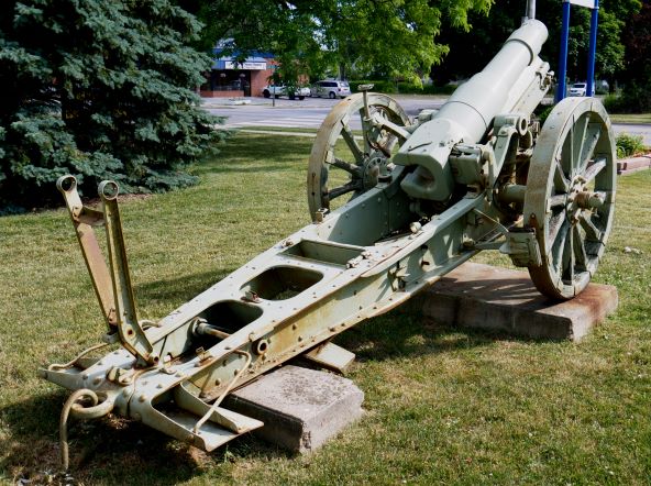 155-mm C1 (M1A2) Medium Howitzer on M1A2 Carriage, aka M114, manufactured at Sorel Industries Limited in Quebec, Queen Elizabeth II cypher.  CFR 34447.  The carriage plate reads: CARR. HOW. 155MM M1A2 CDN. SOREL INDUSTRIES LTD. CANADA (year TBC), REG. NO. CDN 169, INSP (symbol).  This gun stands beside the cenotaph.